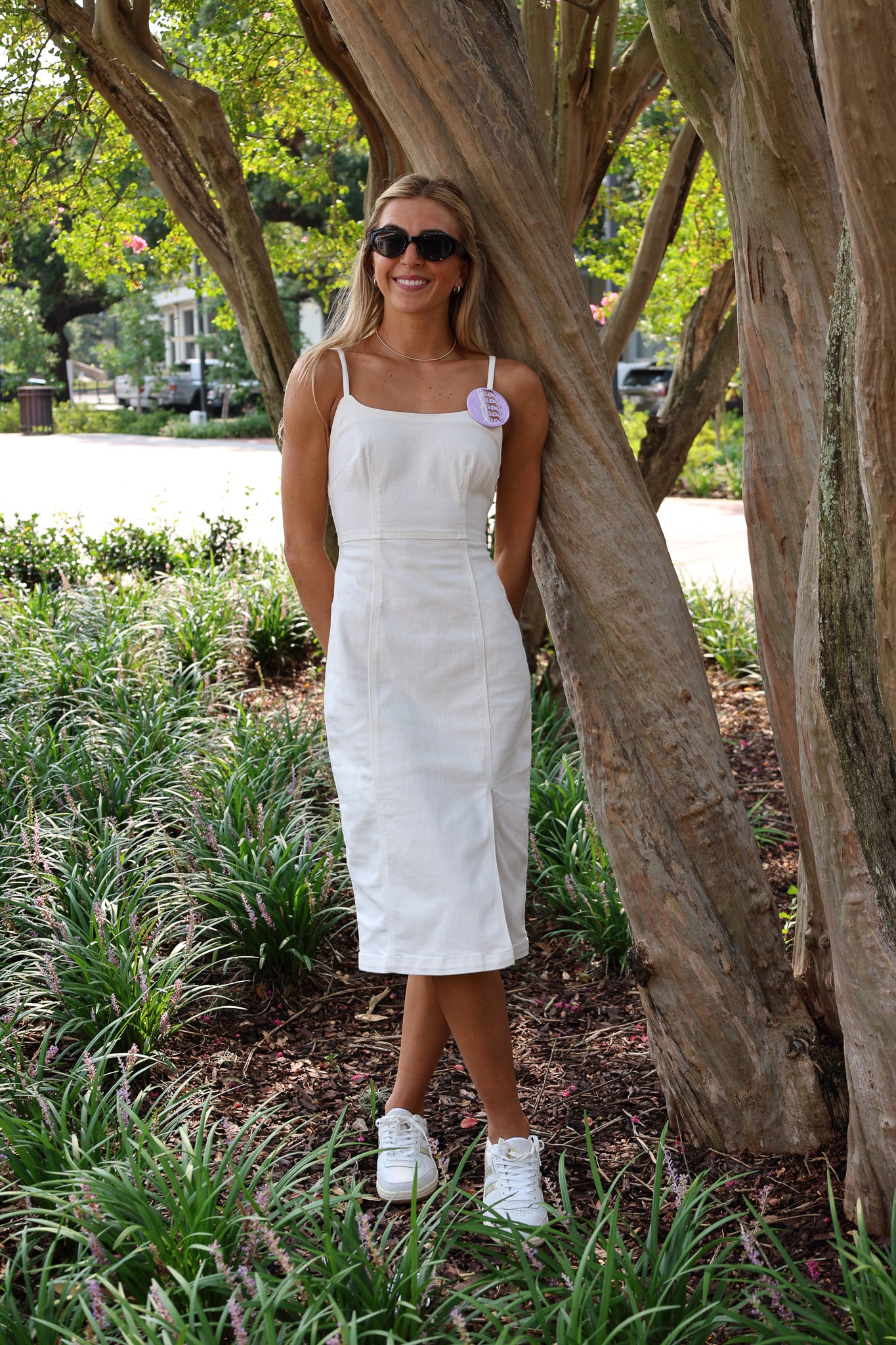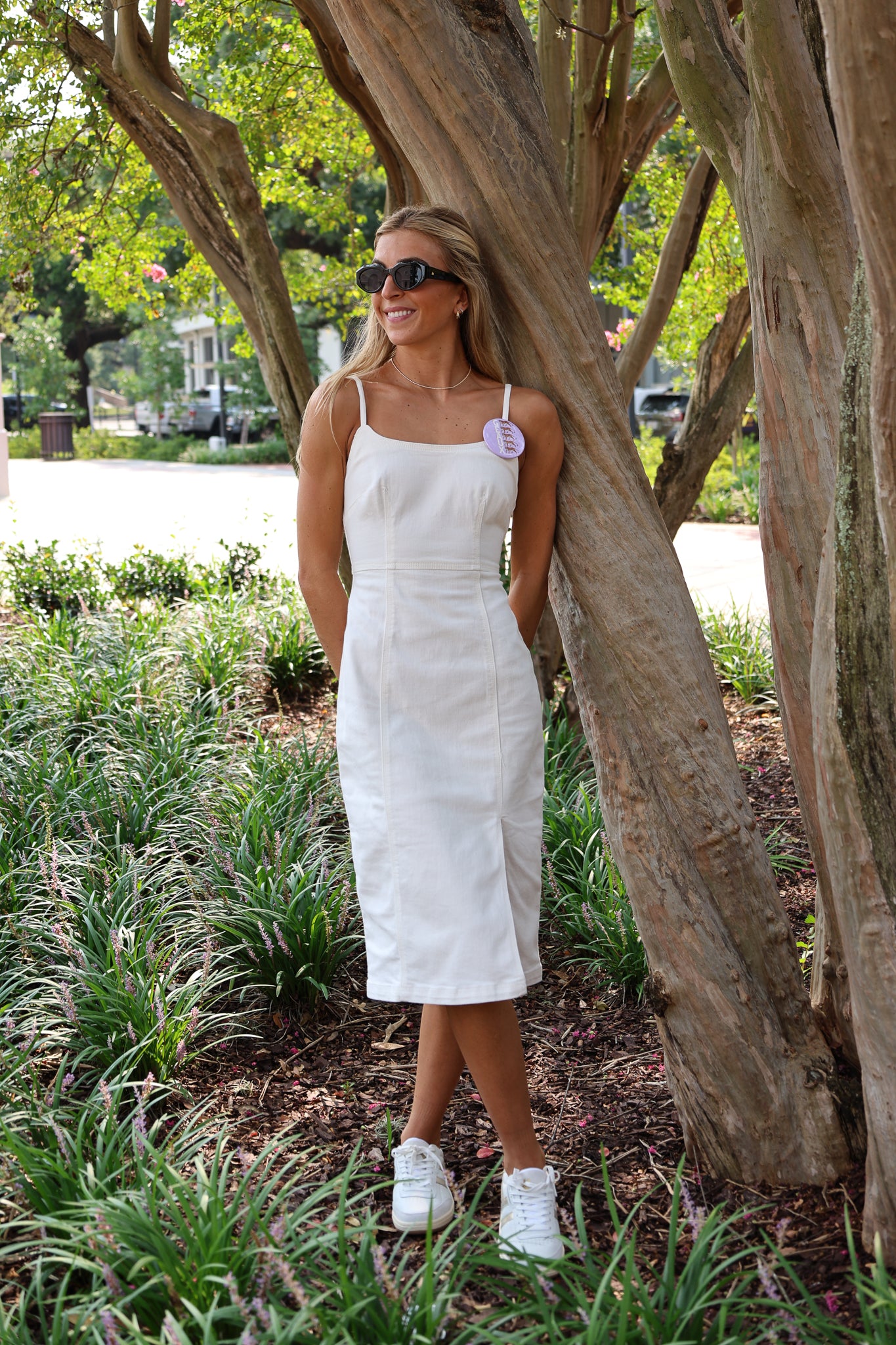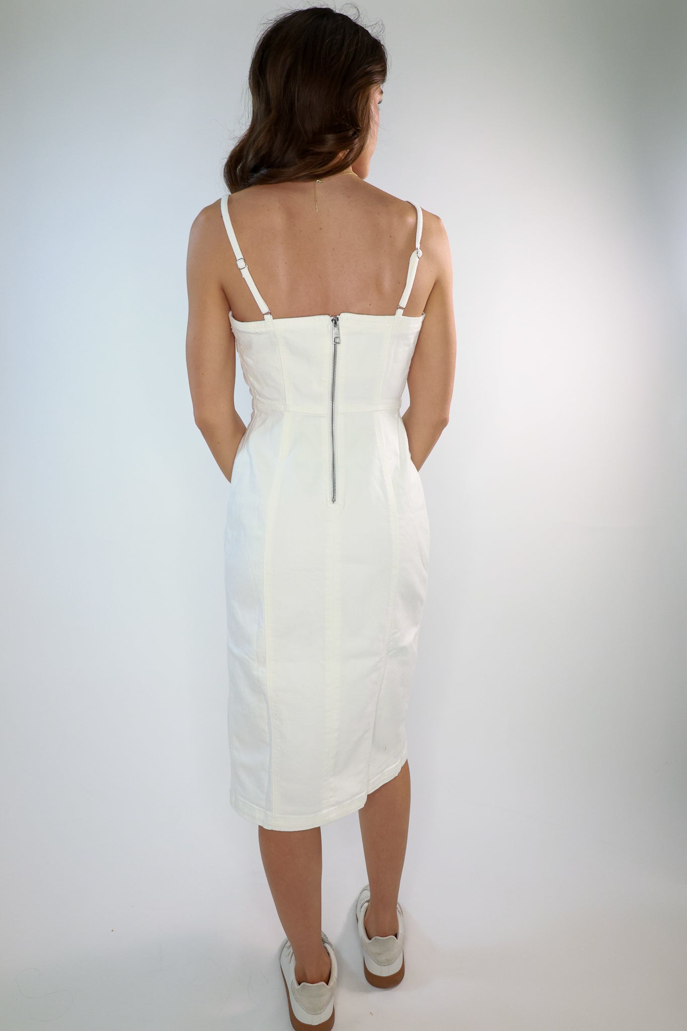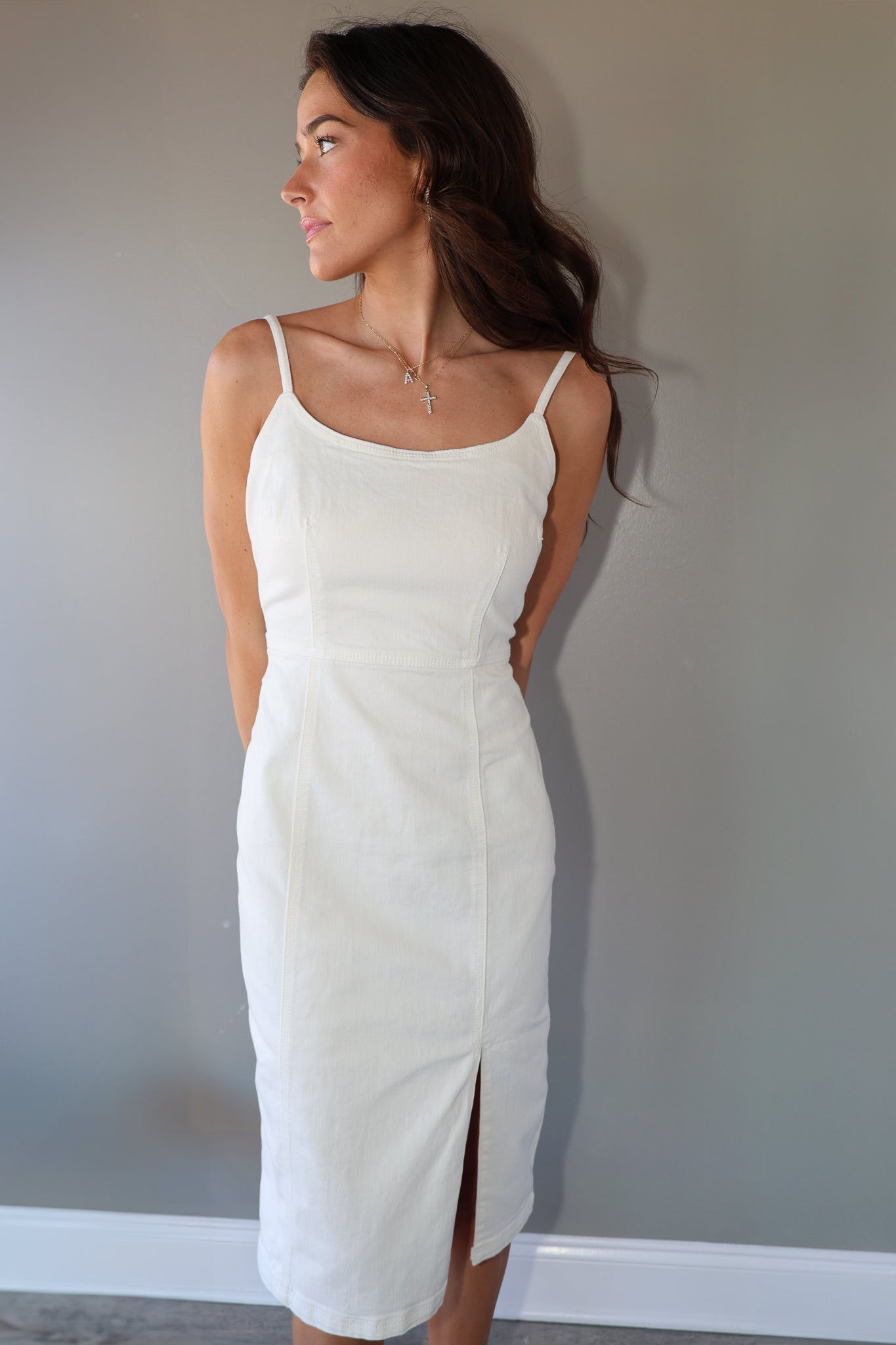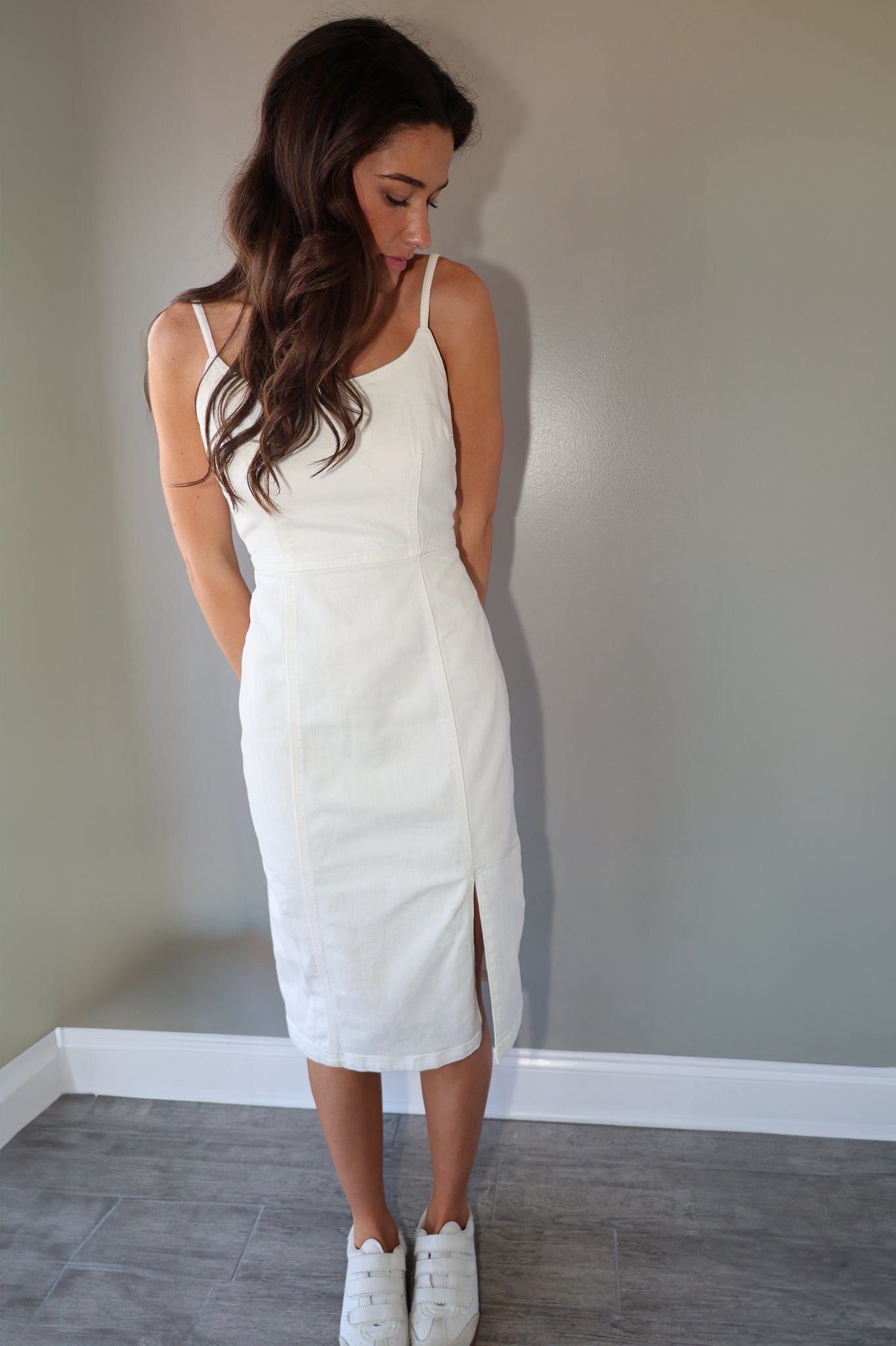 The Giselle Dress boasts a sleek, strapless design in white denim. Featuring a midi length and stylish side slit, this dress is designed to turn heads. Enjoy a comfortable and chic look that will elevate your wardrobe.