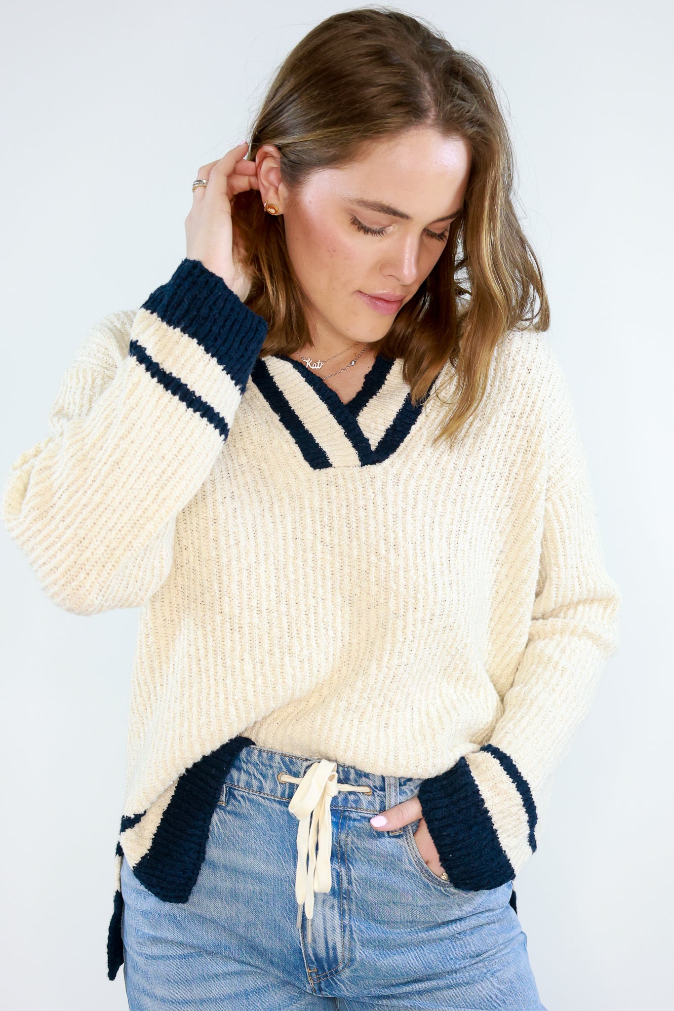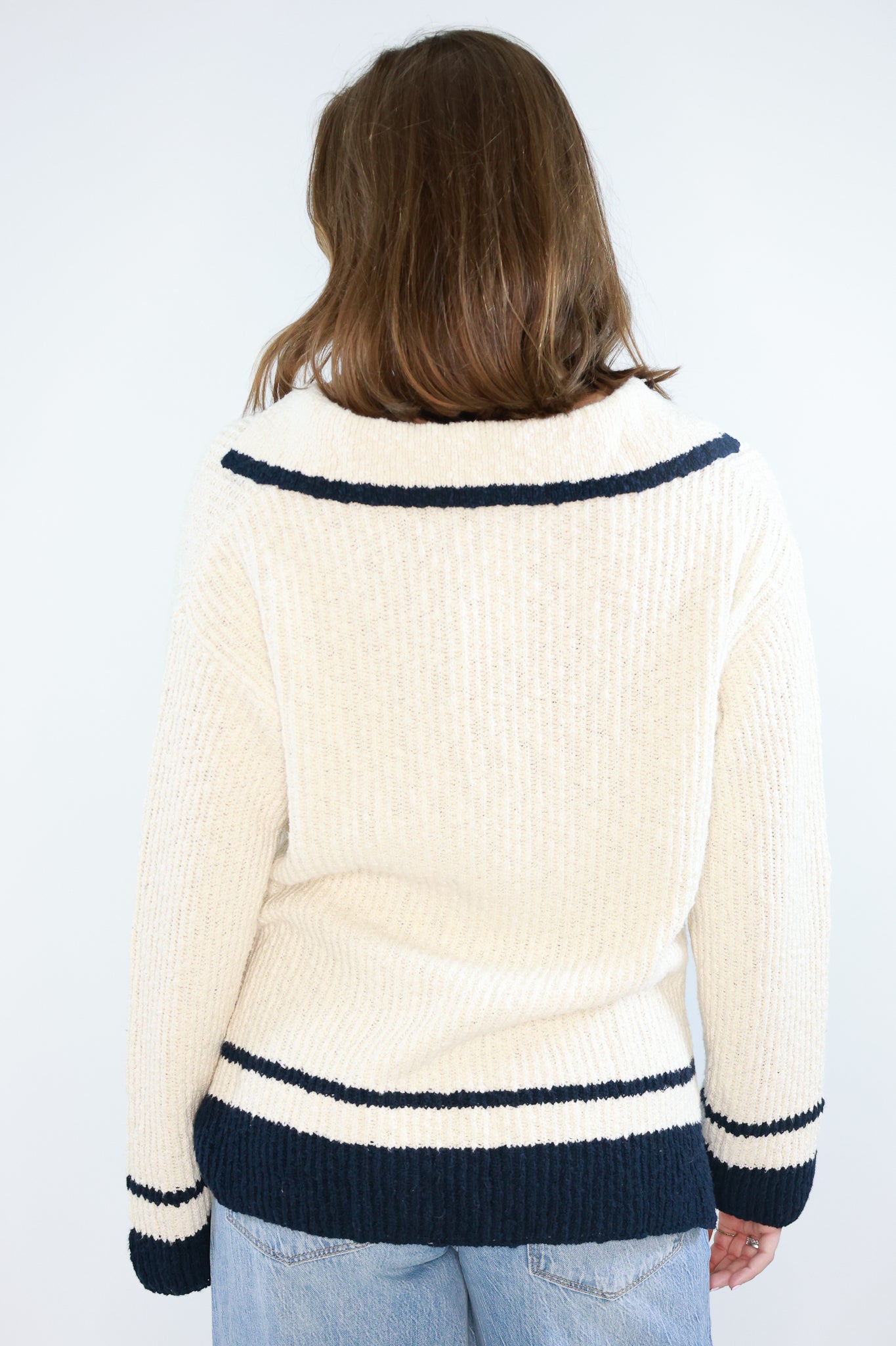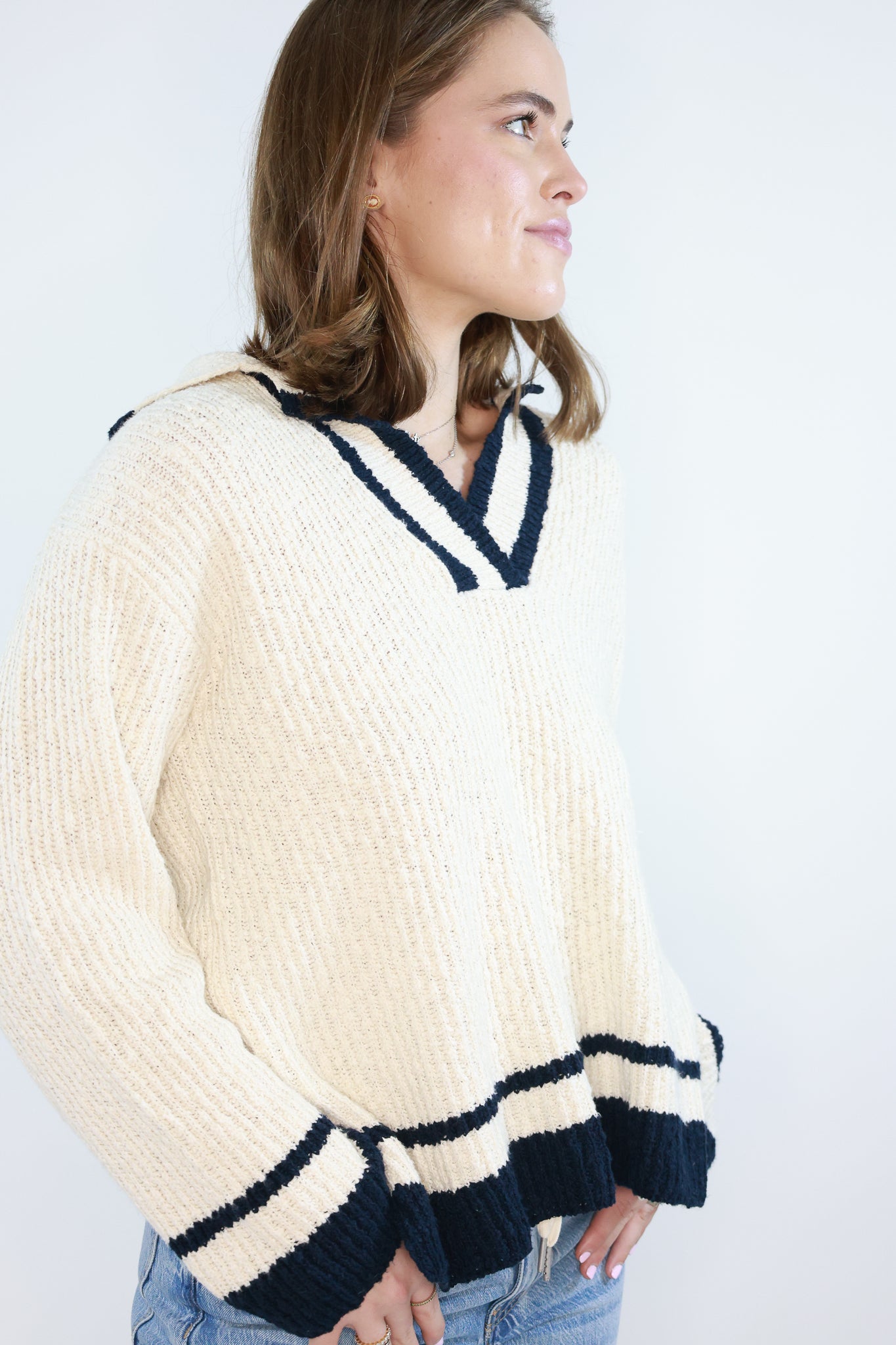 Introducing the Hammond Polo Sweater, perfect for a classic yet contemporary look. This sweater features a sailor collar and v-neck, giving a touch of elegance. The ivory color with navy trim brings a nautical charm, while the loose fit ensures comfort. Elevate your style with this must-have piece.