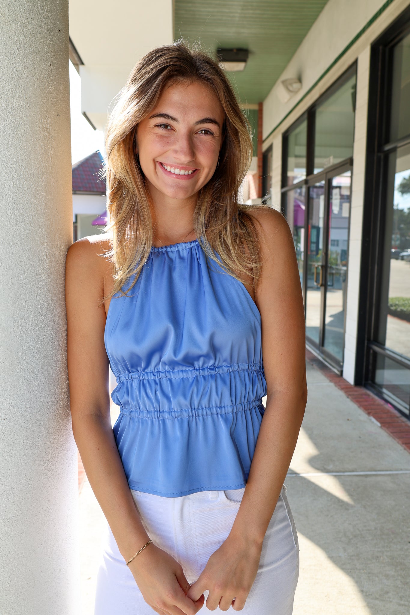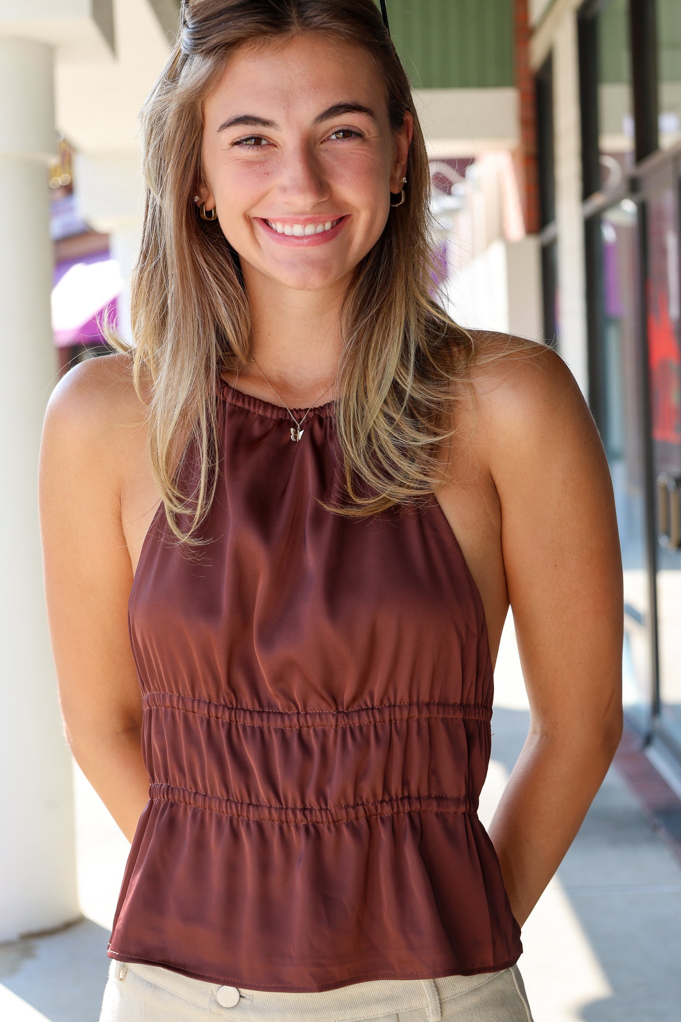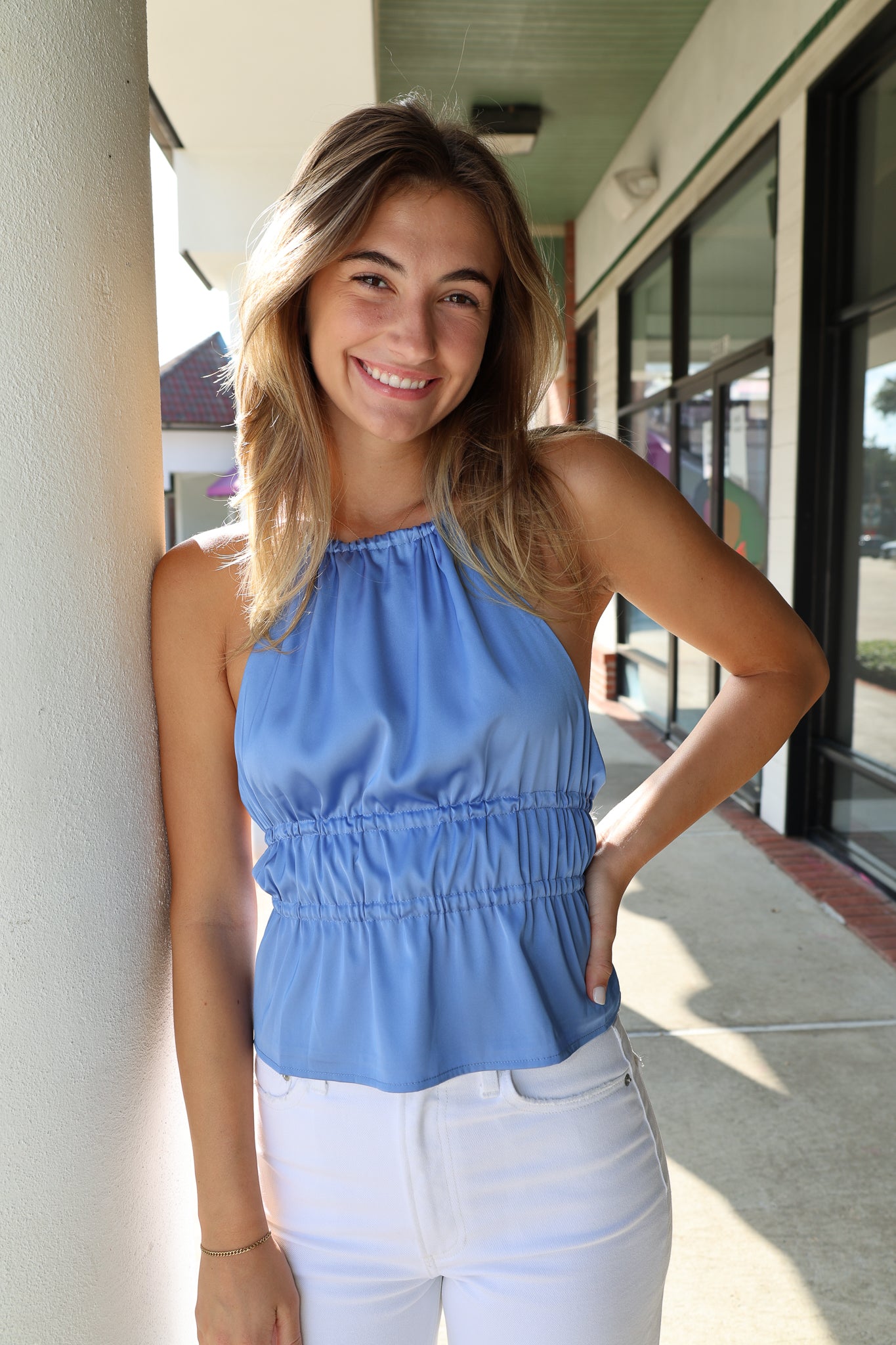 The Heather Halter Top is made from smooth satin and features a stylish backless design with ties at the neck for a cool, adjustable fit. Available in blue or brown, it’s perfect for adding a chic, effortless vibe to any outfit.