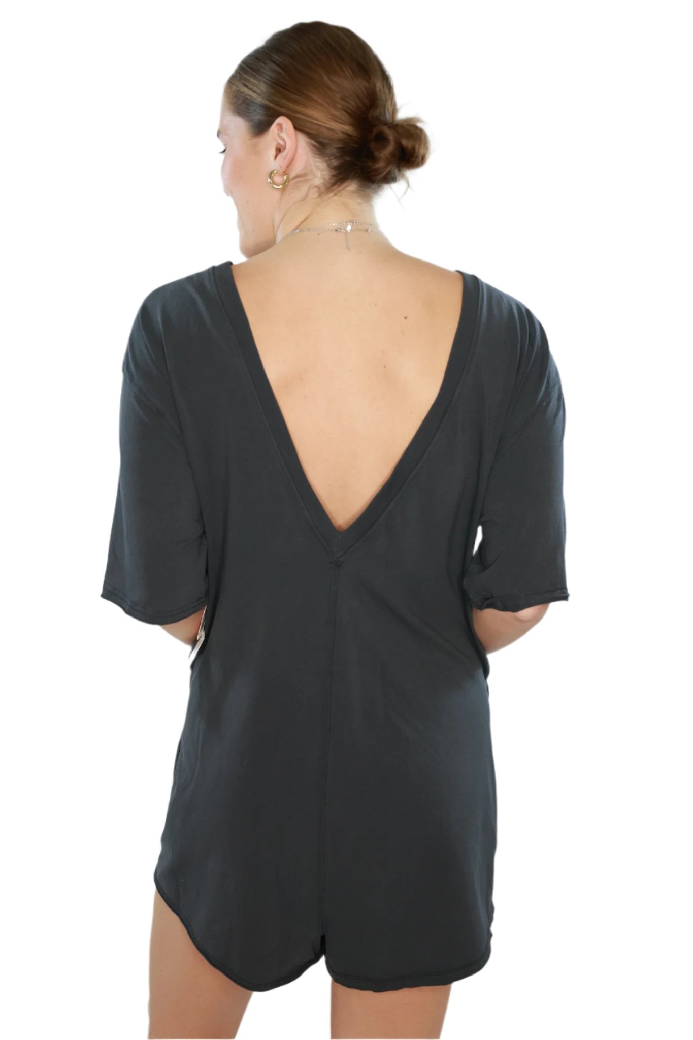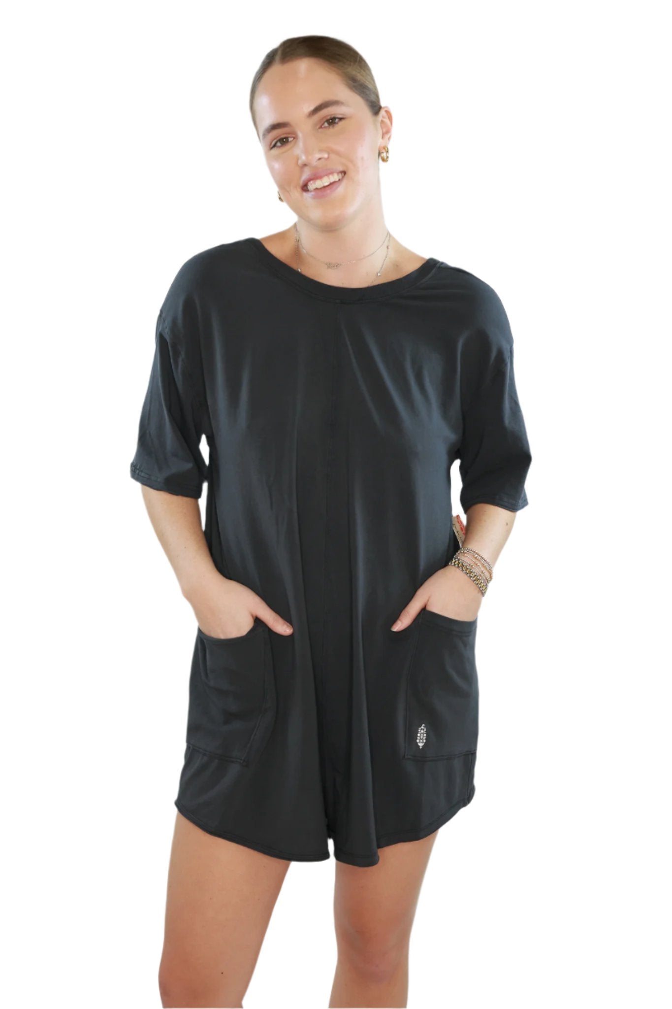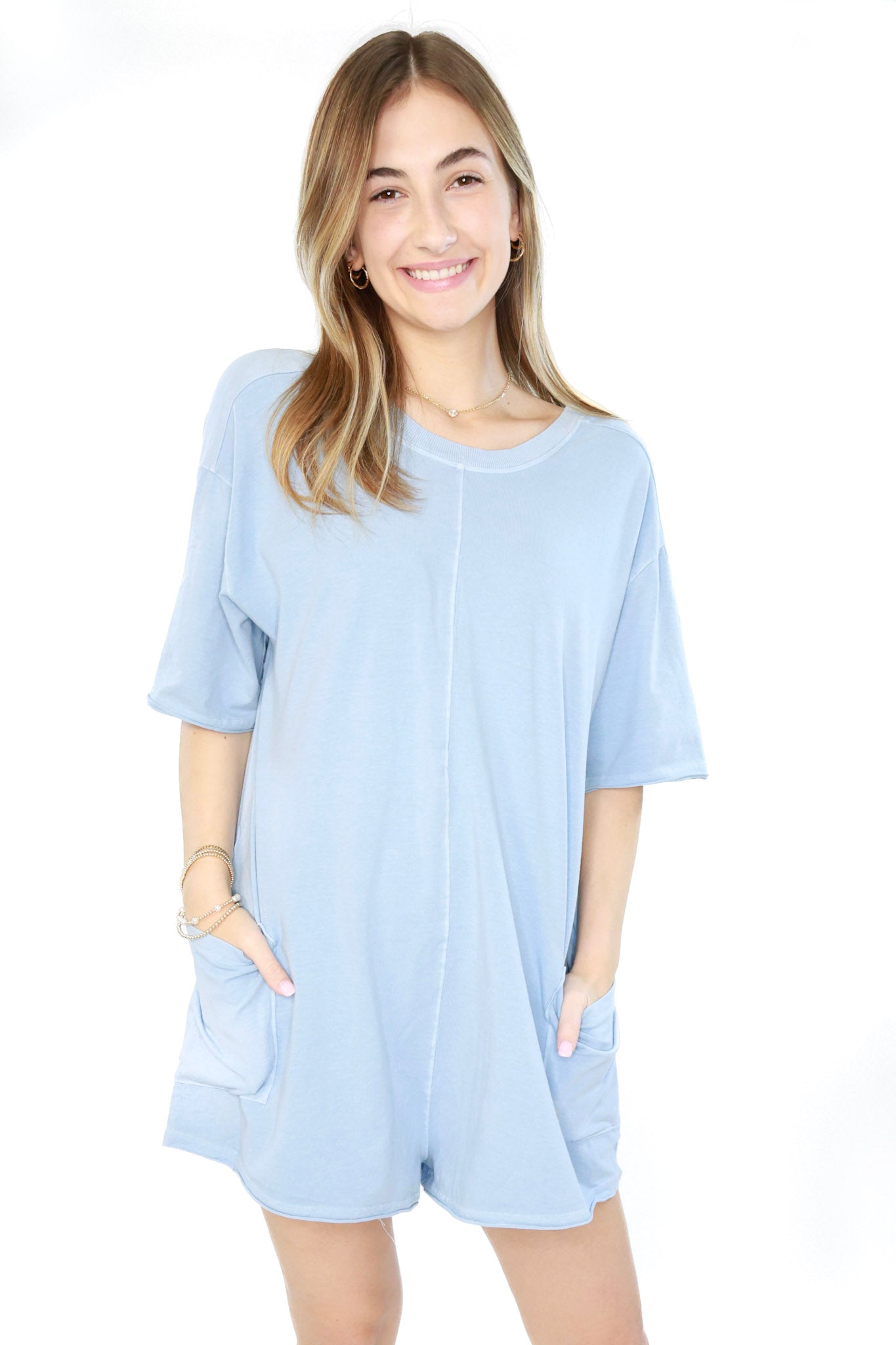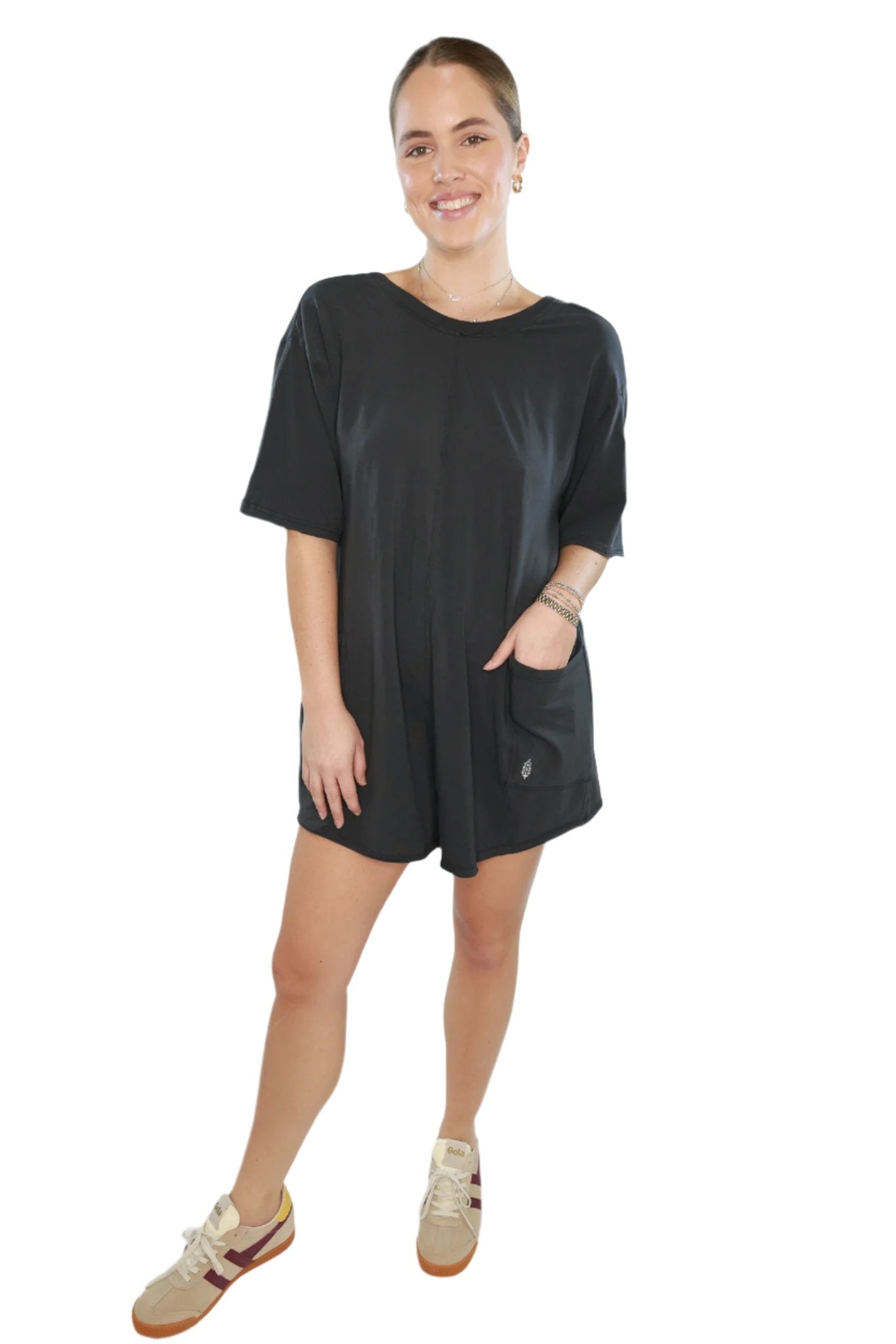 The Hot Shot Tee Romper offers the perfect combination of comfort and style with its t-shirt romper design and short sleeves. Its versatile design allows for easy movement and a cool, casual look. Ideal for any occasion, this romper is a must-have addition to your wardrobe.
