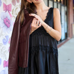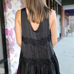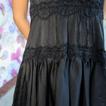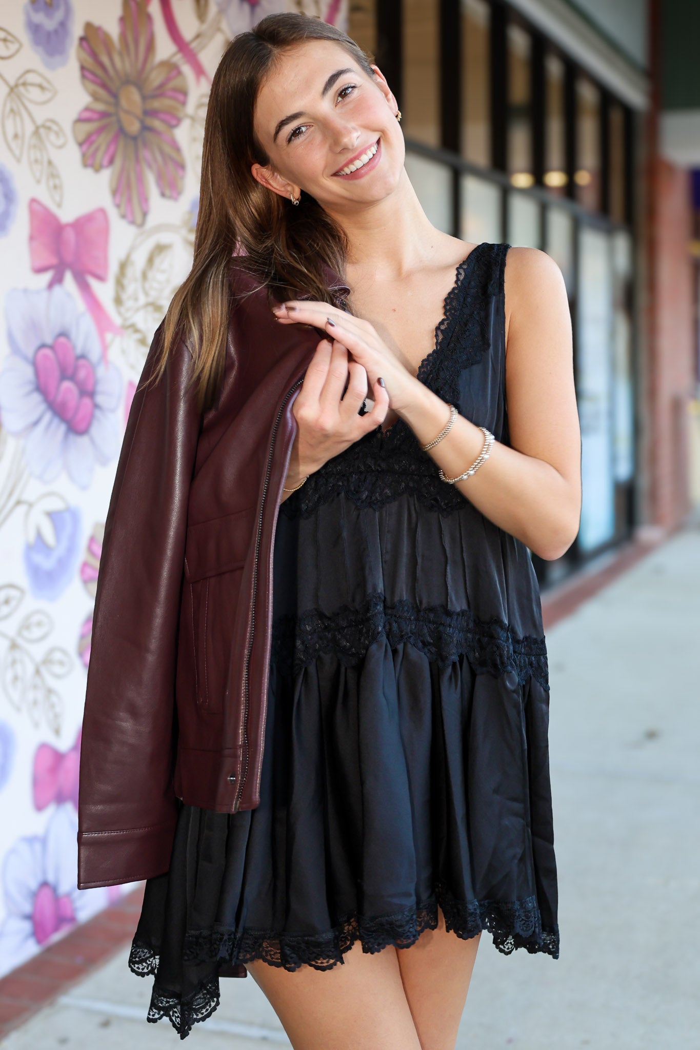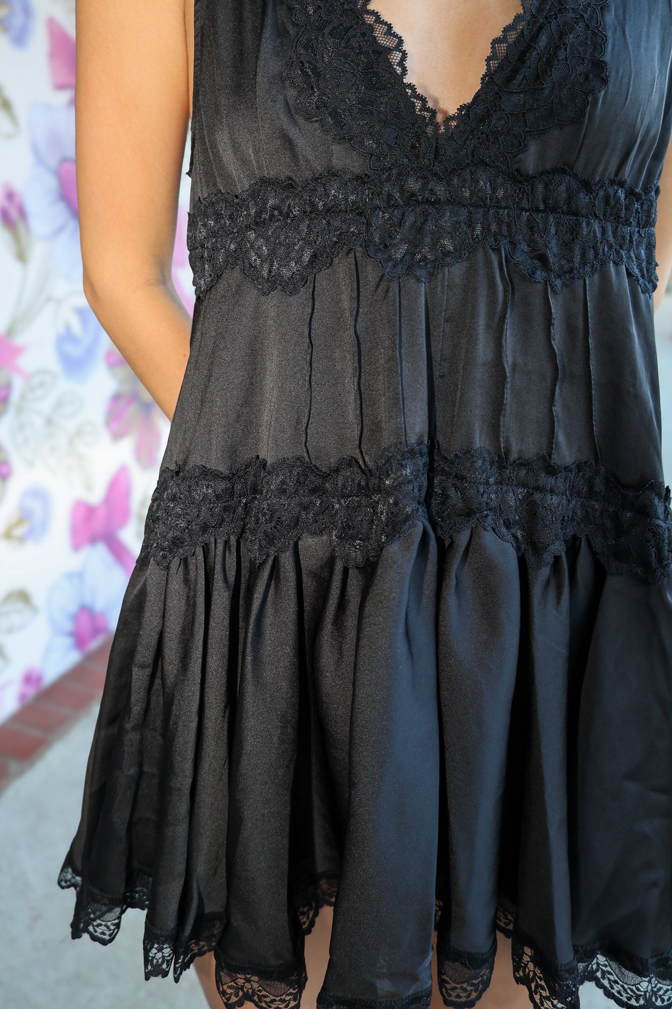 Sleek black satin meets delicate lace trim on this flowy mini that's pure elegance. The sleeveless cut keeps things cool and breezy, while the satin drapes beautifully for that effortless vibe. Lace detailing adds just enough edge to keep it interesting. Whether you're dressing up or keeping it casual, this piece works for literally everything. By Free People.