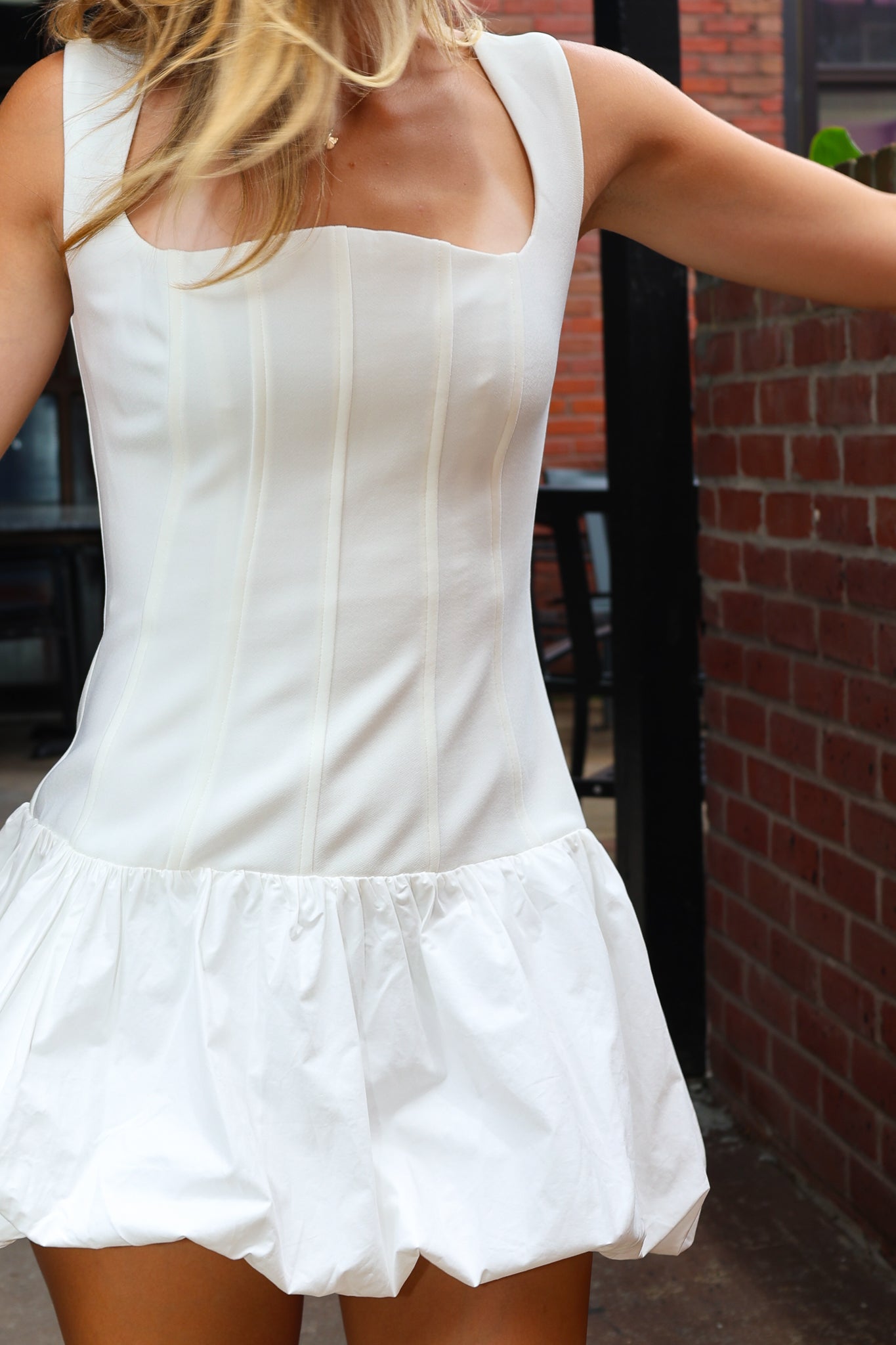 The Ingrid Bubble Mini Dress features a curved neckline paired with a structured corset bodice that sculpts and enhances your figure, creating a refined, feminine silhouette. Made from crisp cotton poplin, its bubble-style skirt adds dynamic volume and fluid movement, offering a contemporary update to the timeless white dress. This piece expertly balances classic elegance with modern design elements.
