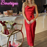 The Isla Dress is a stunning red midi slip with a swooping neckline and open back that demands attention. A sleek side zipper keeps the look polished while the draped details add an effortless, sophisticated edge. Perfect for a formal night out.