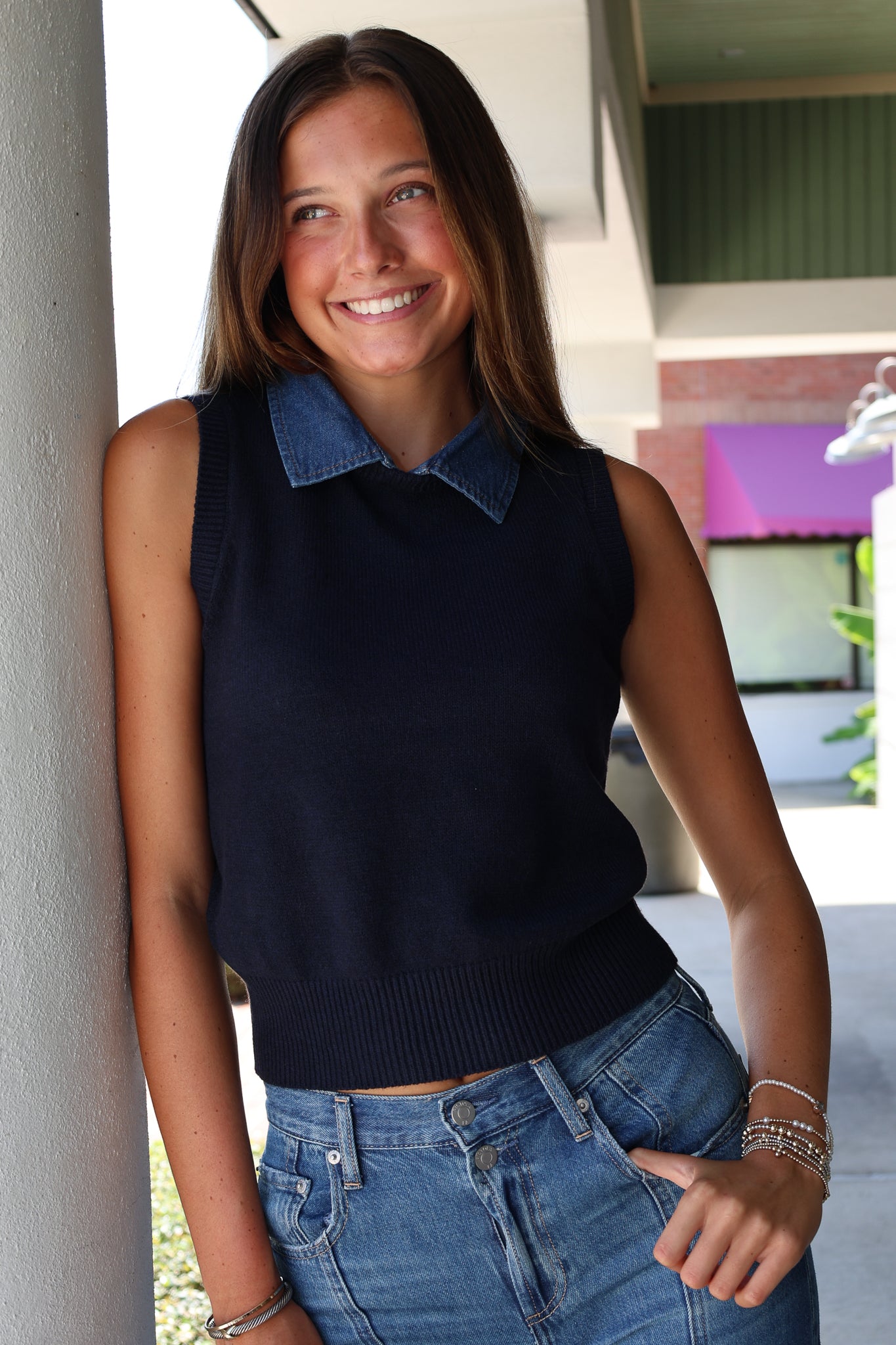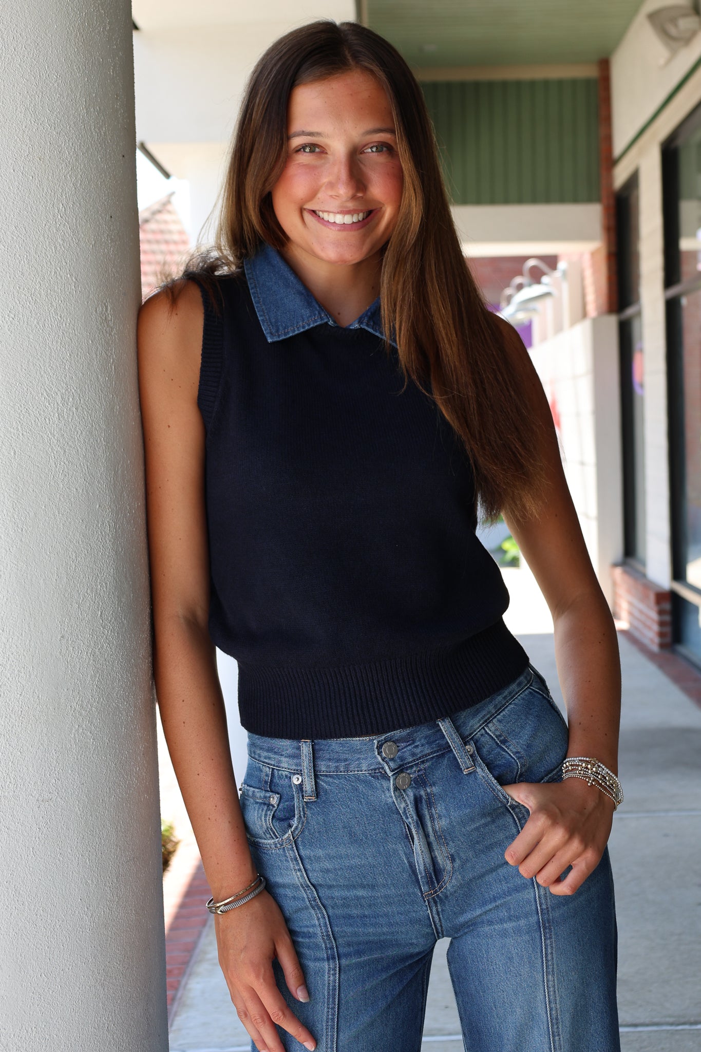 Stay cool and comfy with the Jeane Sweater Vest, featuring a detachable denim collar for an easy switch-up between casual and edgy vibes. Perfect for layering over your fave tees or dresses, this vest lets you mix and match styles effortlessly. Whether you're heading to school or hanging out with friends, it's a fun, stylish piece that'll keep you looking fresh and unique.