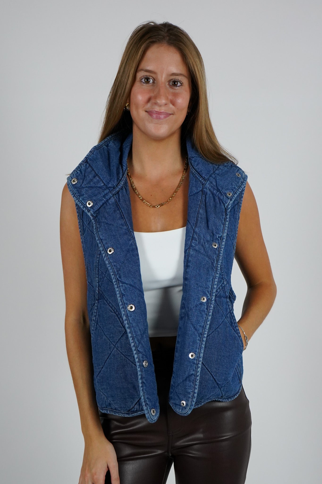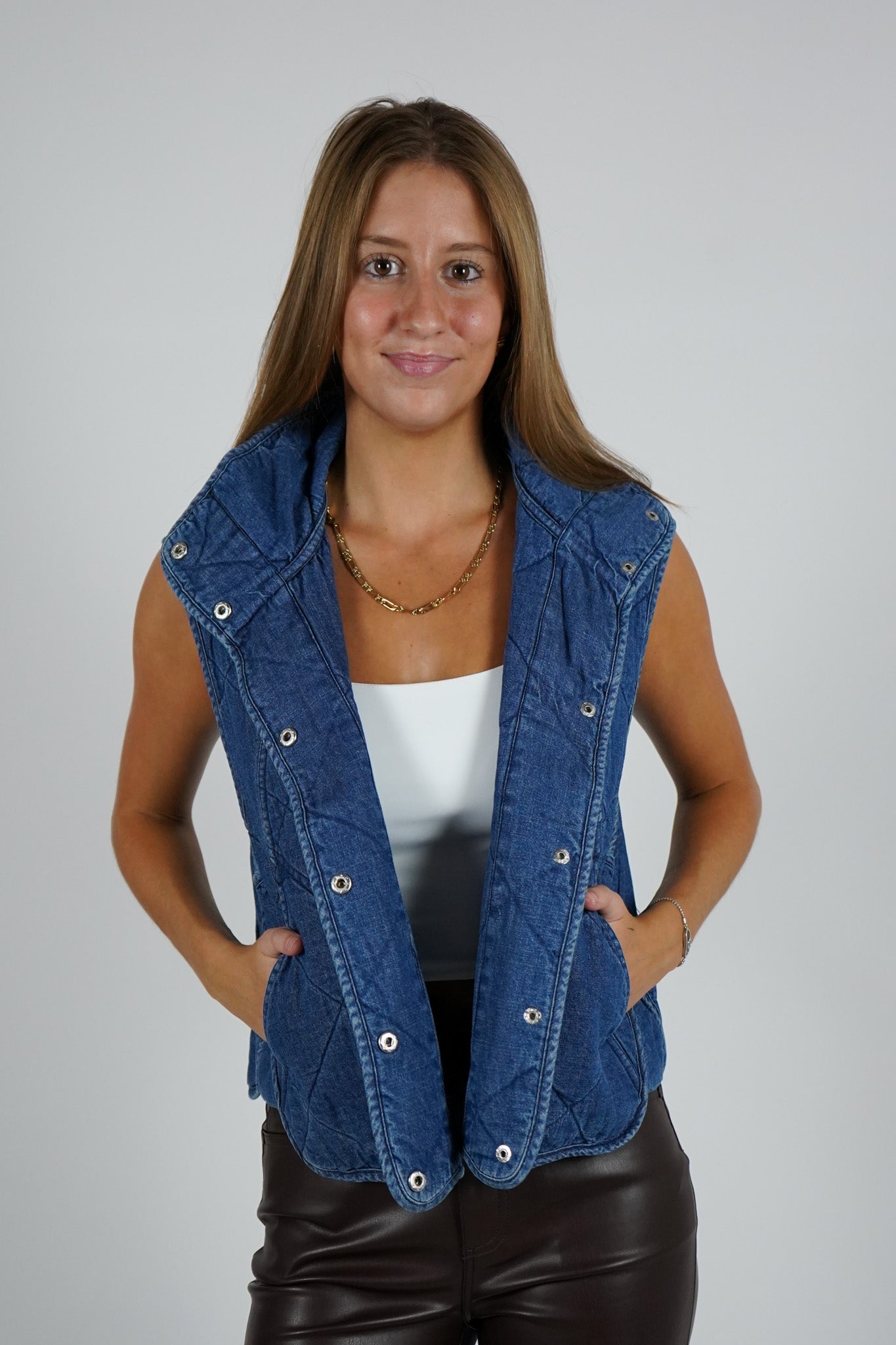 Expertly crafted and reliably durable, the Jennifer Denim Vest adds the perfect touch of chic to any outfit with its quilted design. Stay warm and stylish with this essential layering piece.