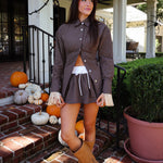 The Jules Top is a brown plaid long-sleeve button-down with a cool lace-up back detail. It’s perfect for adding a little edge to your casual look while staying comfy and stylish for school or chill hangouts.