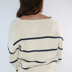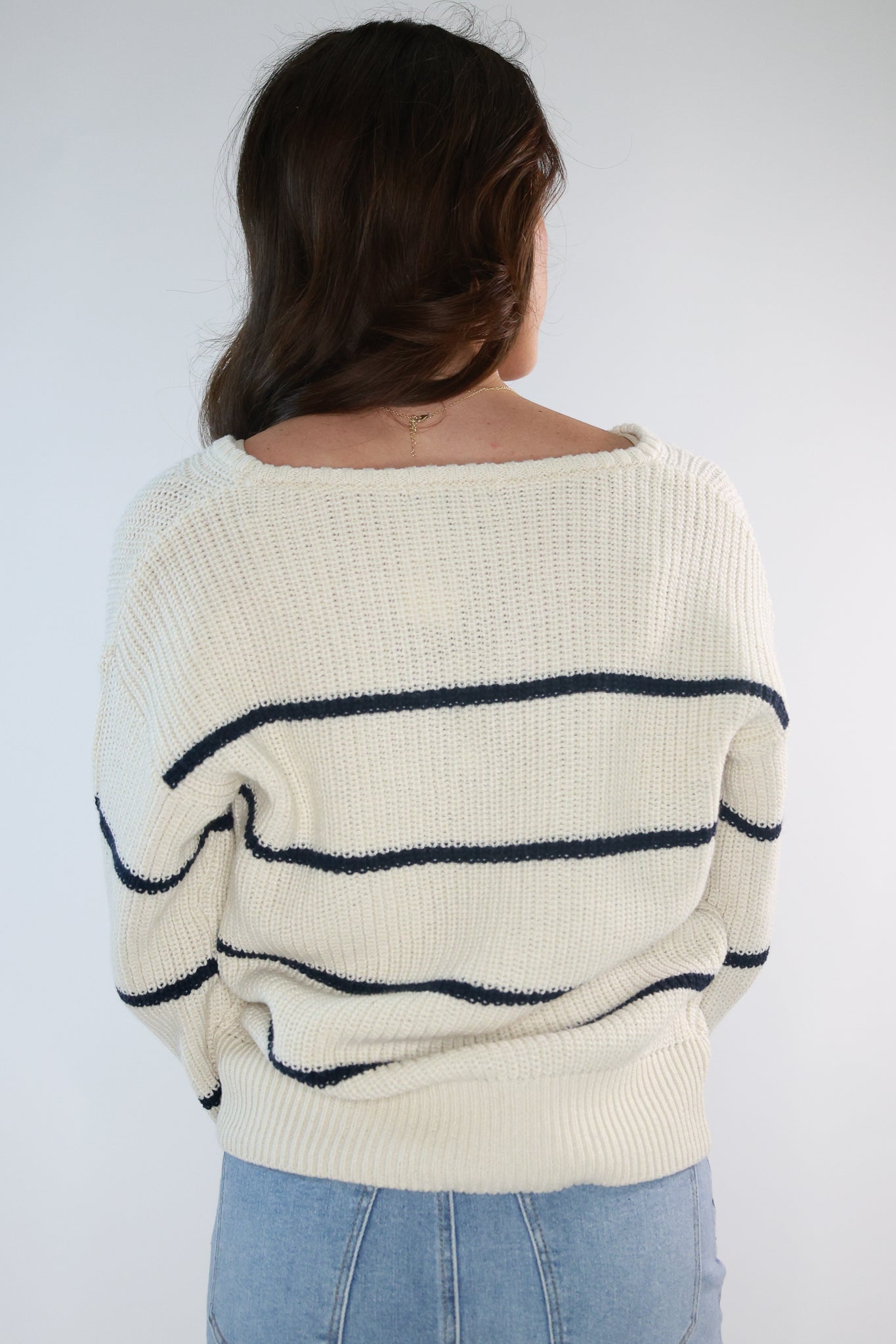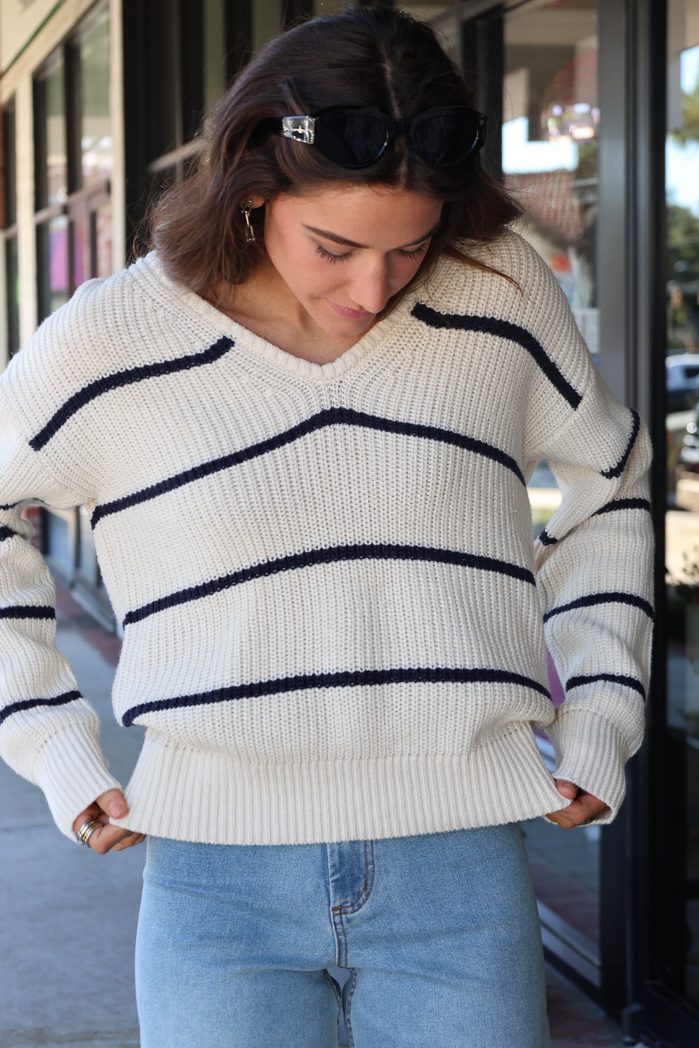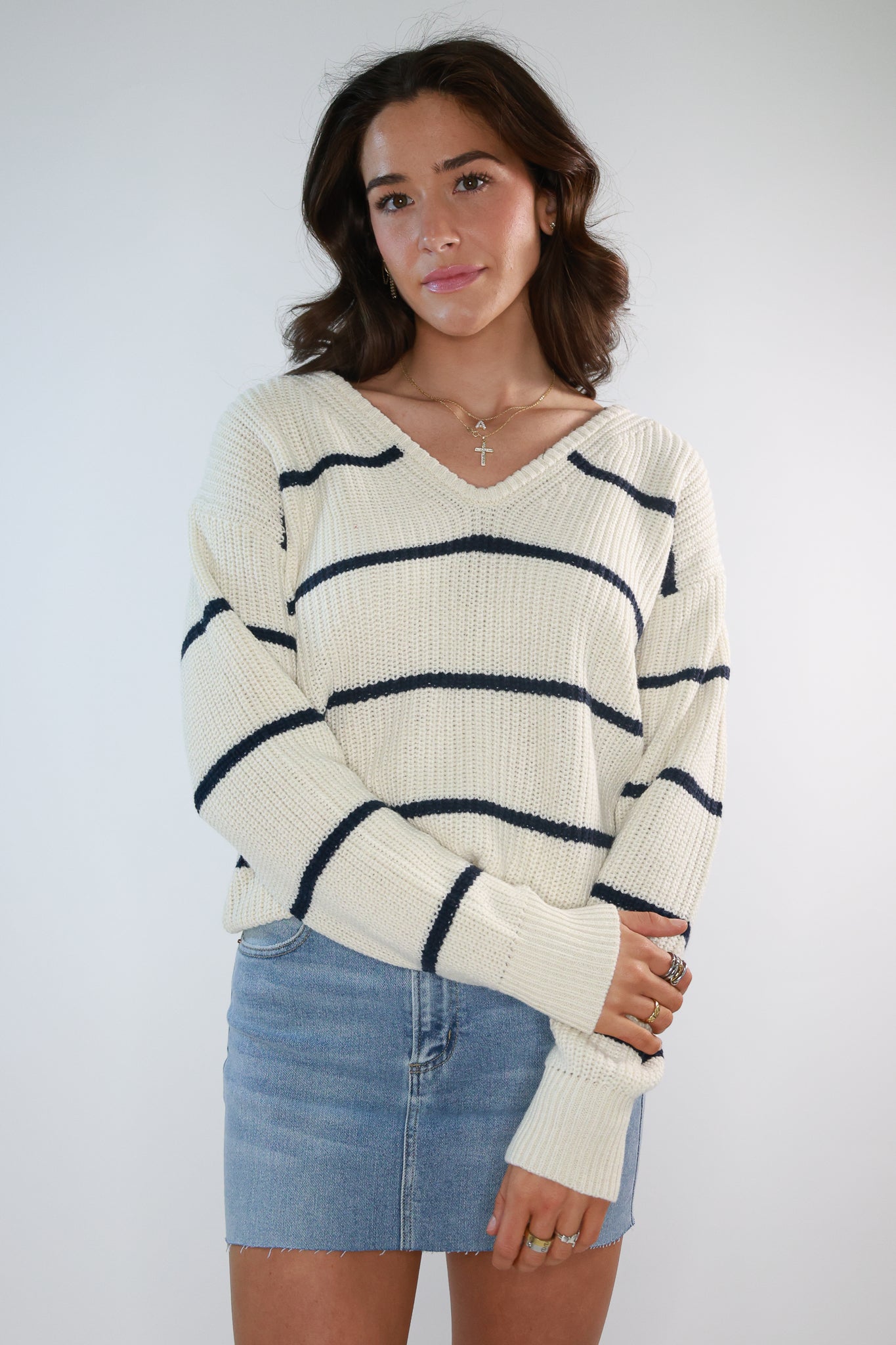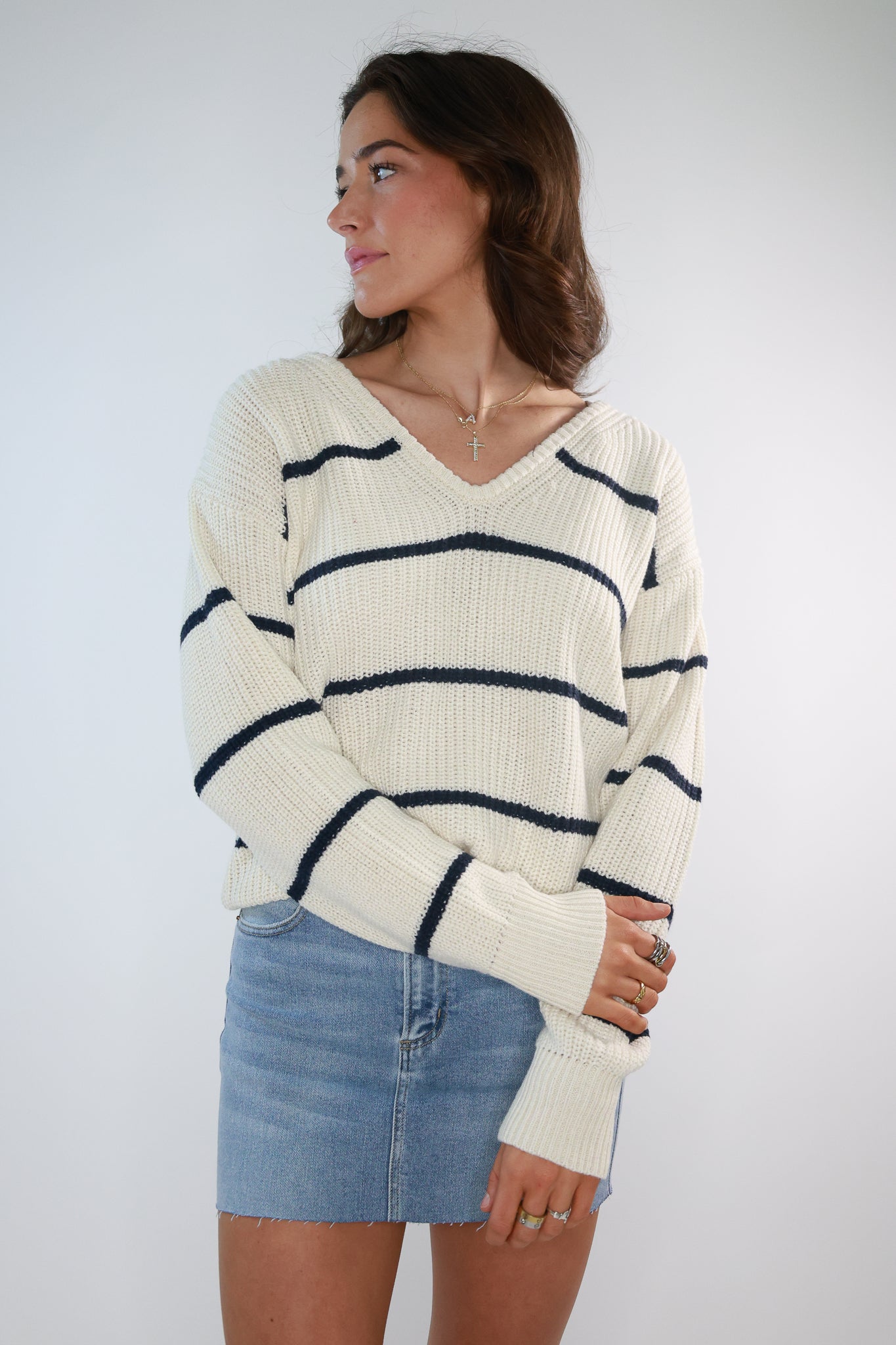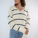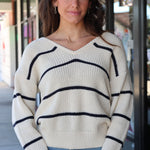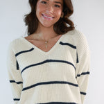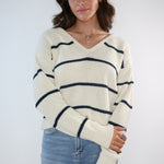 The Kaitlyn Sweater combines timeless style with effortless comfort. Featuring a flattering v-neckline and classic stripe pattern, this sweater exudes a chic and sophisticated look. Made with high-quality materials, it offers both softness and durability. Upgrade your wardrobe with this must-have piece.