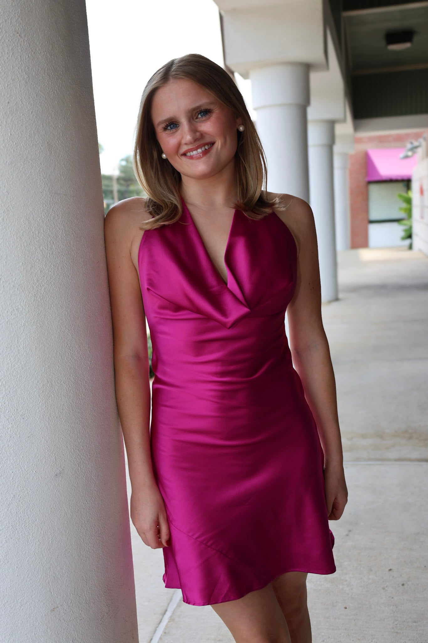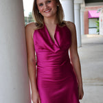 The Kelly Dress is the perfect mix of cute and cool! This satin mini dress features a trendy cowl neckline and a halter style that shows off your shoulders in the best way. It’s super smooth and shiny, making it great for parties or a night out with your friends. Easy to style, fun to wear, and totally on point for your next event!