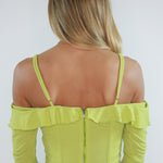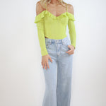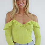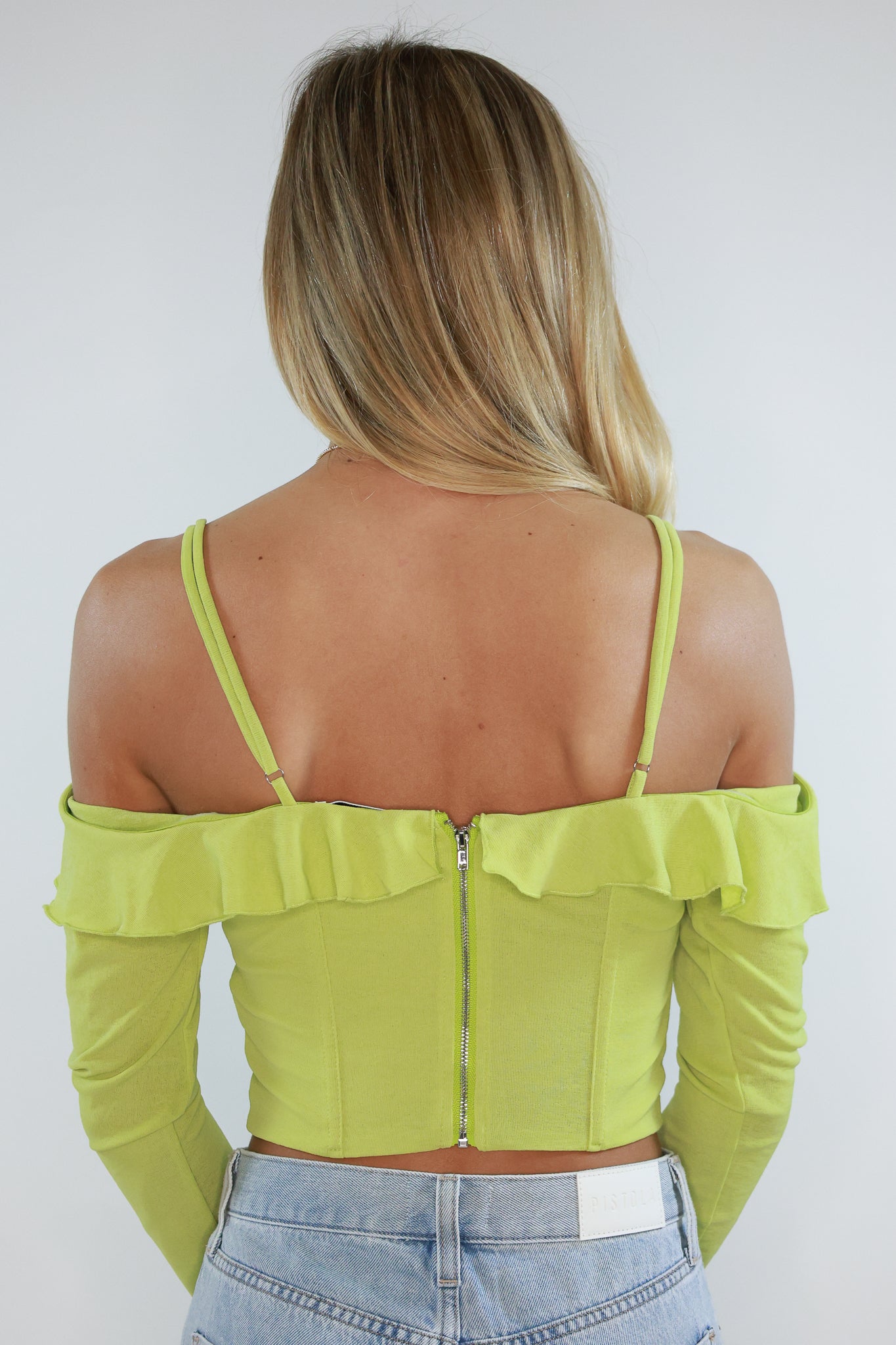 The Kendall Top is a stylish and versatile addition to any wardrobe. With its vibrant lime green color and off the shoulder design, it is perfect for making a statement. The long sleeves and corset top add a touch of sophistication, while the ruffle detailing and zip back provide a modern twist. Elevate your look with this trendy piece.