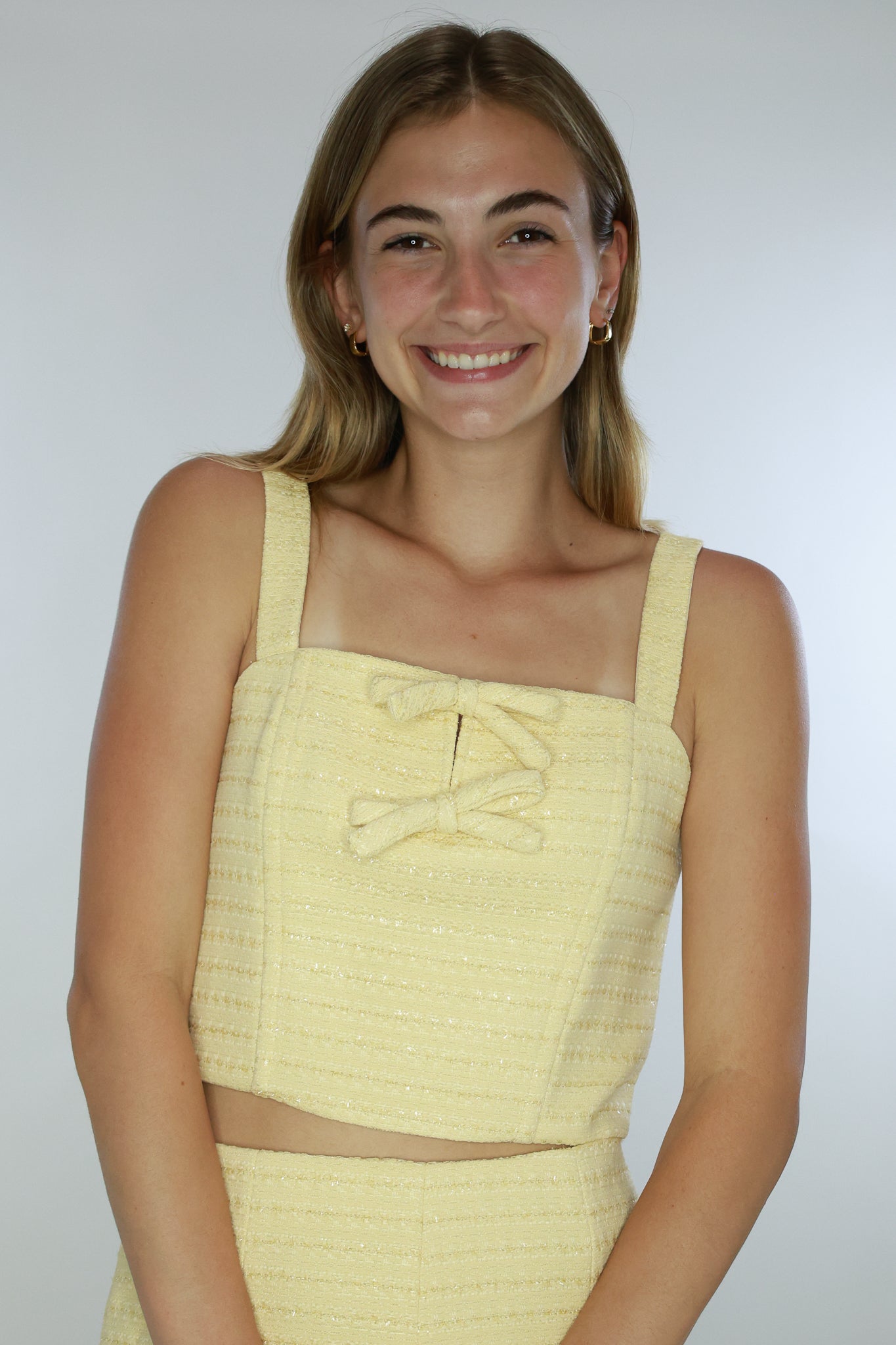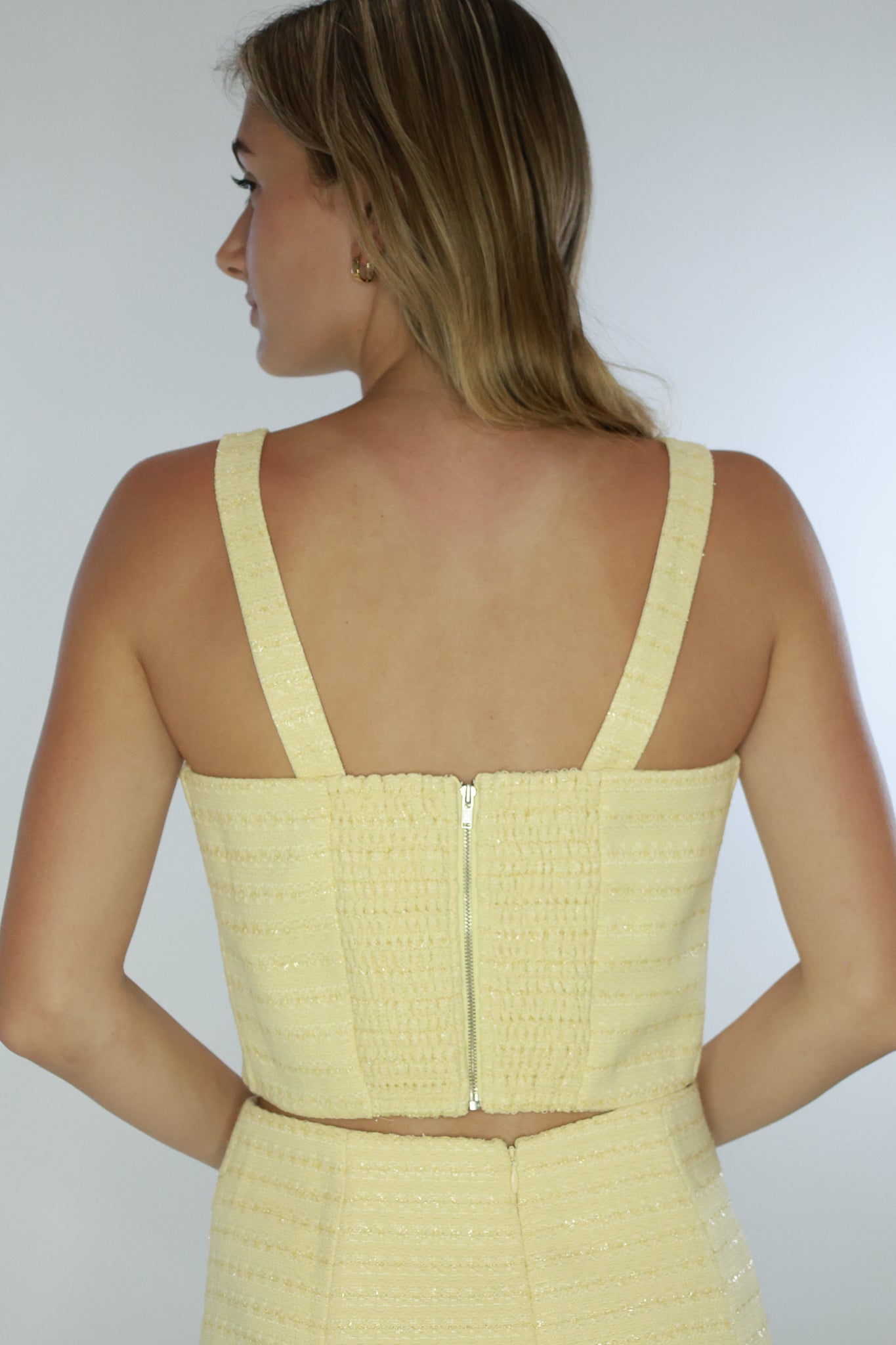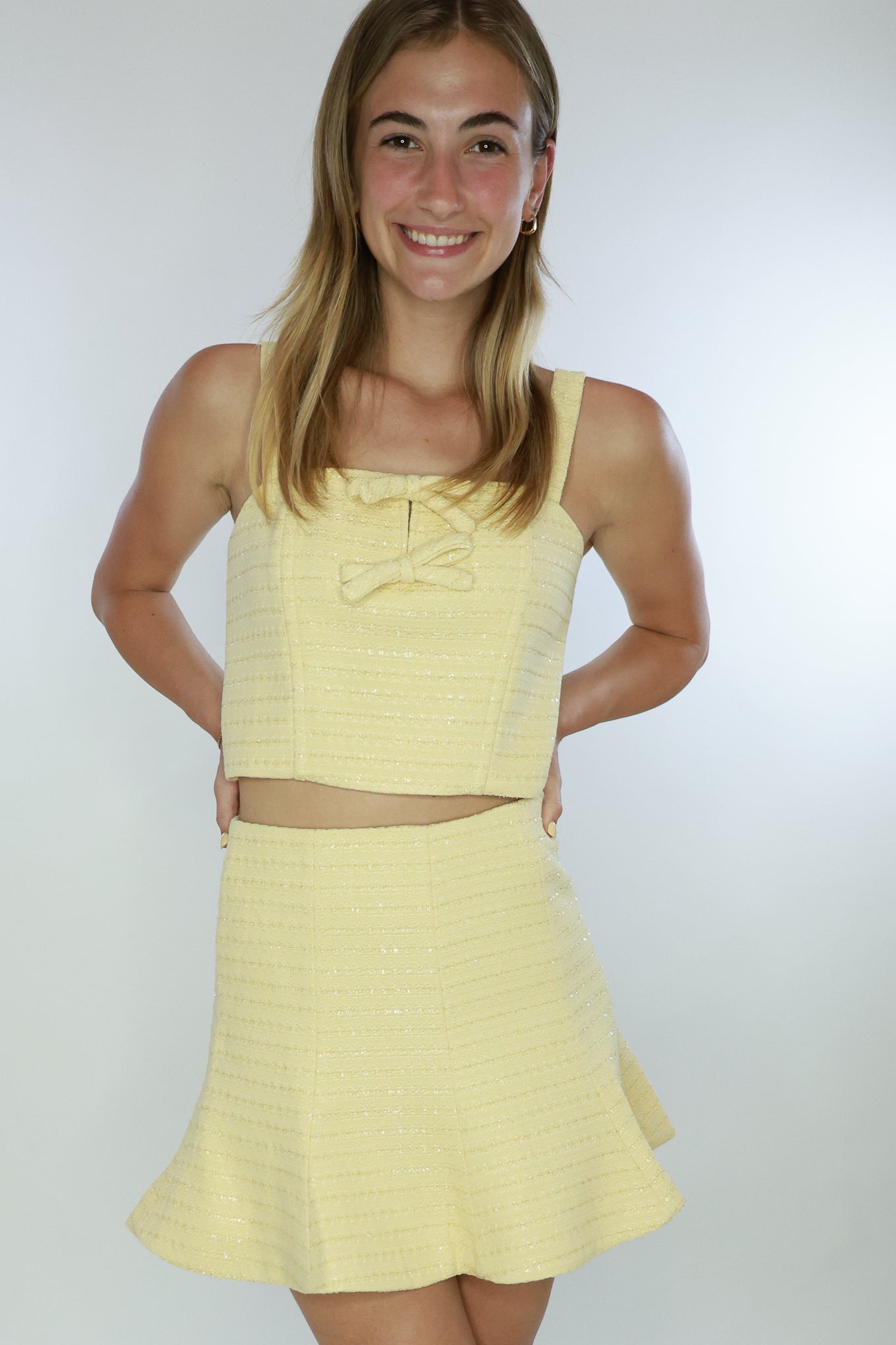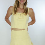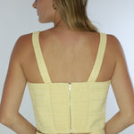Elevate your wardrobe with the Kiona Top. Its sleeveless design and elegant bow detail add a touch of sophistication to any outfit. Made from premium tweed, this top pairs perfectly with the Kiona Mini Skirt for a timeless and luxurious look. Adjustable straps.