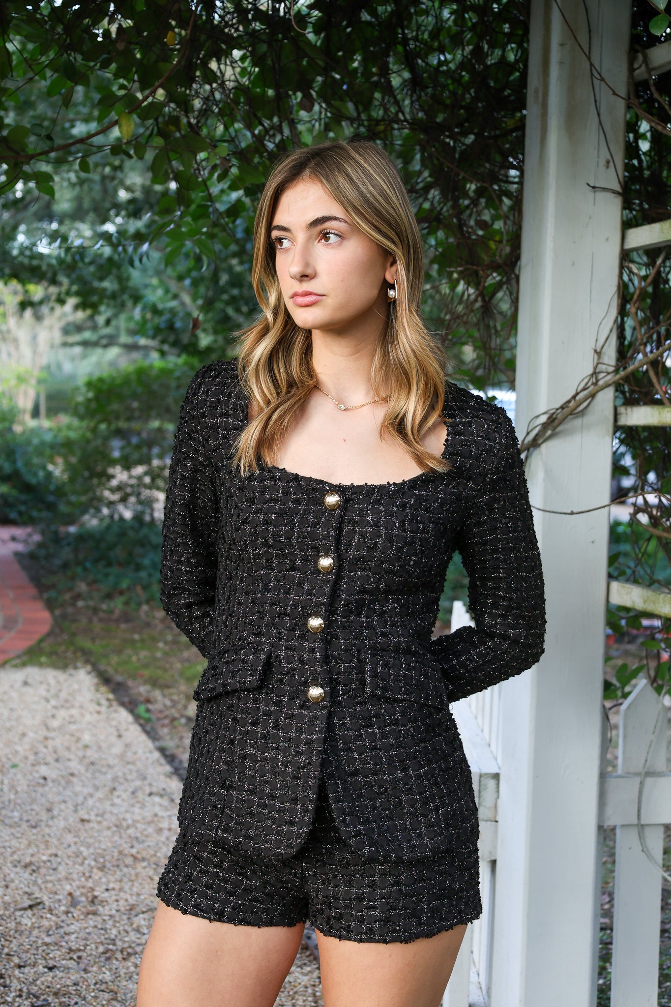 Expertly crafted for the discerning fashionista, our Kya Romper by Amanda Uprichard is the perfect blend of style and sophistication. The sleek black and shimmer fabric is accented with luxurious gold buttons, elevating this long sleeve romper to a must-have in any wardrobe. Stand out from the crowd with this stunning piece.
