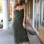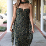 Tiger print sheer strapless dress with pleated detailing and full lining for a polished look. Comes with a matching scarf to complete your outfit. Perfect for adding bold animal print vibes to your wardrobe.