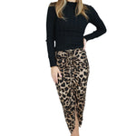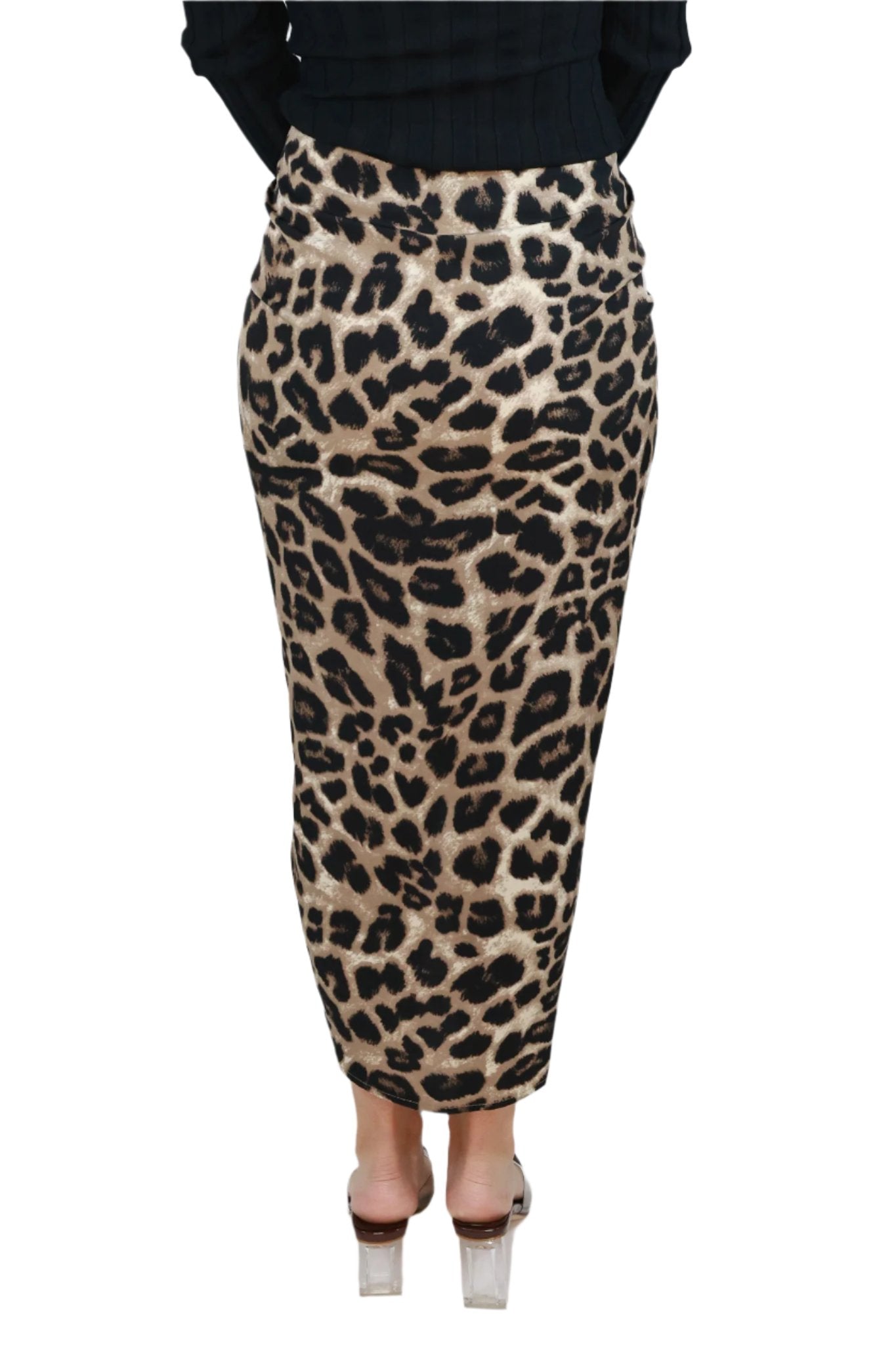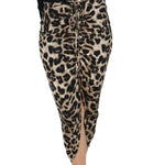 Expertly crafted from high-quality fabric, the Leo Ruched Skirt features a fierce leopard print design that will make a statement. The ruched front and front slit provide a flattering silhouette, while the zipper and tie closure ensure a secure and comfortable fit. Channel your inner fashionista with this must-have midi skirt.