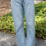 The Lexi Pant rocks a cool light wash denim look with silver studs scattered all over the front for that edgy vibe. Perfect for adding a bit of sparkle to your everyday outfit while keeping it casual and comfy. These pants will easily become your go-to for standing out without trying too hard.