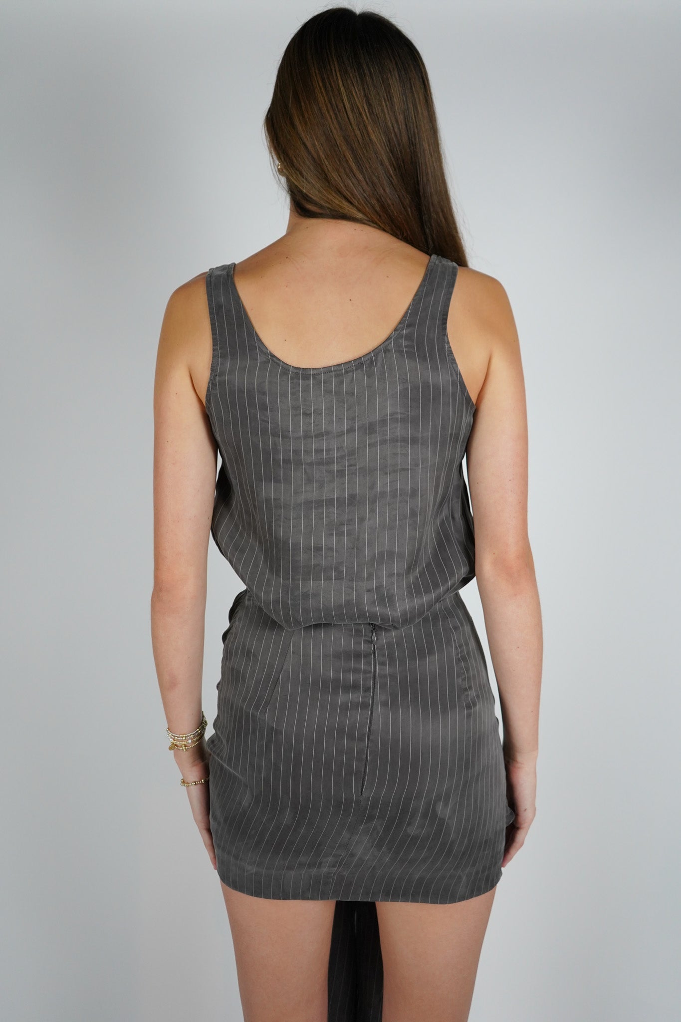 Introducing the Lily Skirt! This grayish and white pinstripe mini skirt is both stylish and versatile. Its satin long tie in the front adds a touch of elegance and can be tied in various ways for a custom fit. Dress it up or down for any occasion!