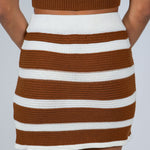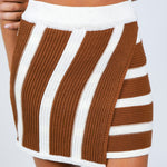 Add a playful pop of London style to your wardrobe with our multi-directional brown and white stripe faux wrap mini skirt! Guaranteed to turn heads and give your outfit a unique touch. You'll be the talk of the town in this fashionable and quirky skirt. Pair with our London Top!