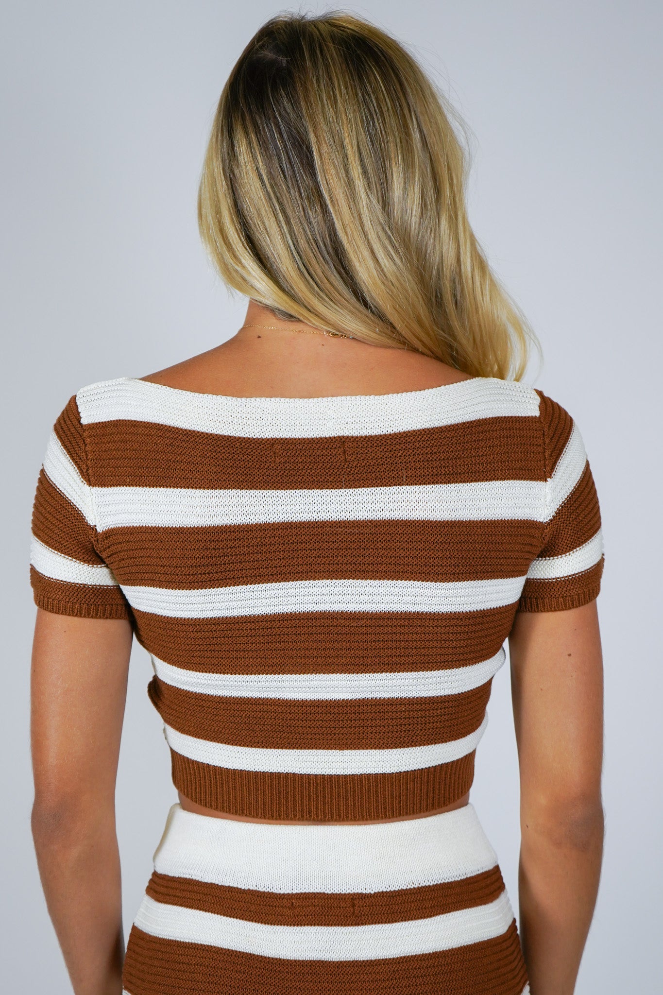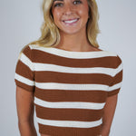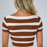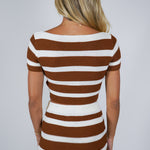 We love this London Top! Featuring a brown and white stripe design, this boat neck knit top pairs perfectly with the London Skirt for a complete look. Sail away in style with this playful duo!
