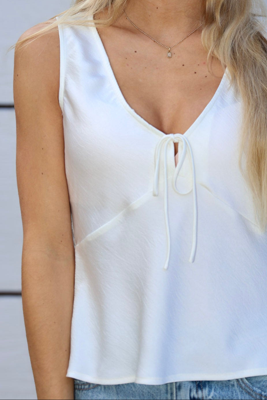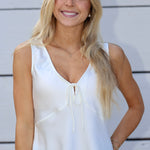 The Luana Top is your go-to for effortless elegance. Crafted from smooth satin that feels amazing against your skin, this sleeveless top features a charming front tie that adds instant personality and a feminine vibe. Perfect for dressing up a casual outfit or keeping it chic for any occasion.