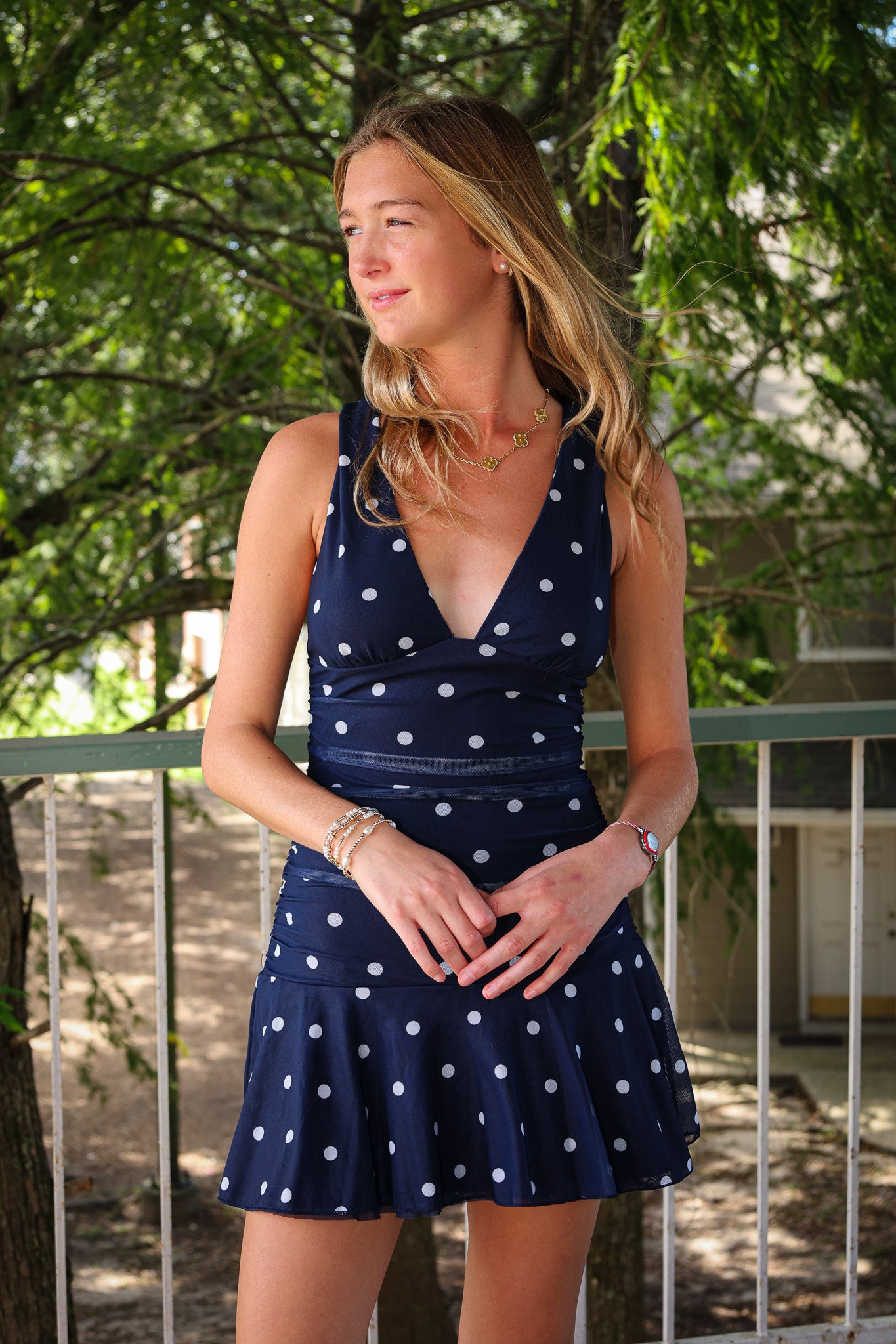 The Lucille Mini Dress is super cute with blue and white polka dots all over. It’s sheer but lined, so you won’t have to worry about it being see-through. The plunging neckline adds a little edge, and the ruffle skirt gives it a fun, flirty vibe perfect for hanging out or parties. It’s the perfect mini dress to make you stand out effortlessly!