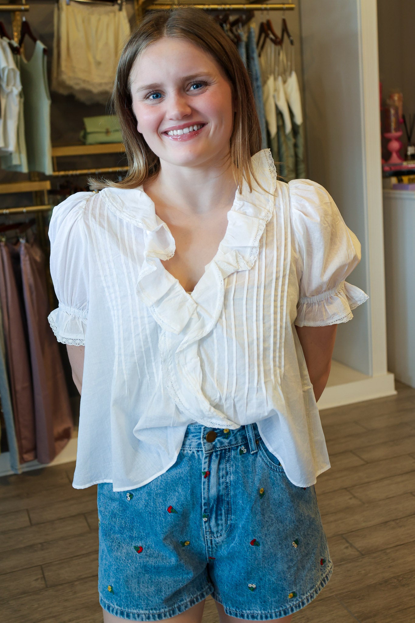 The Lyric Top is a delicate white blouse that balances romance with everyday wearability, featuring a flattering V-neckline and intricate pleating throughout. Ruffled short sleeves and neckline detailing create a feminine, vintage-inspired look that works for any occasion.