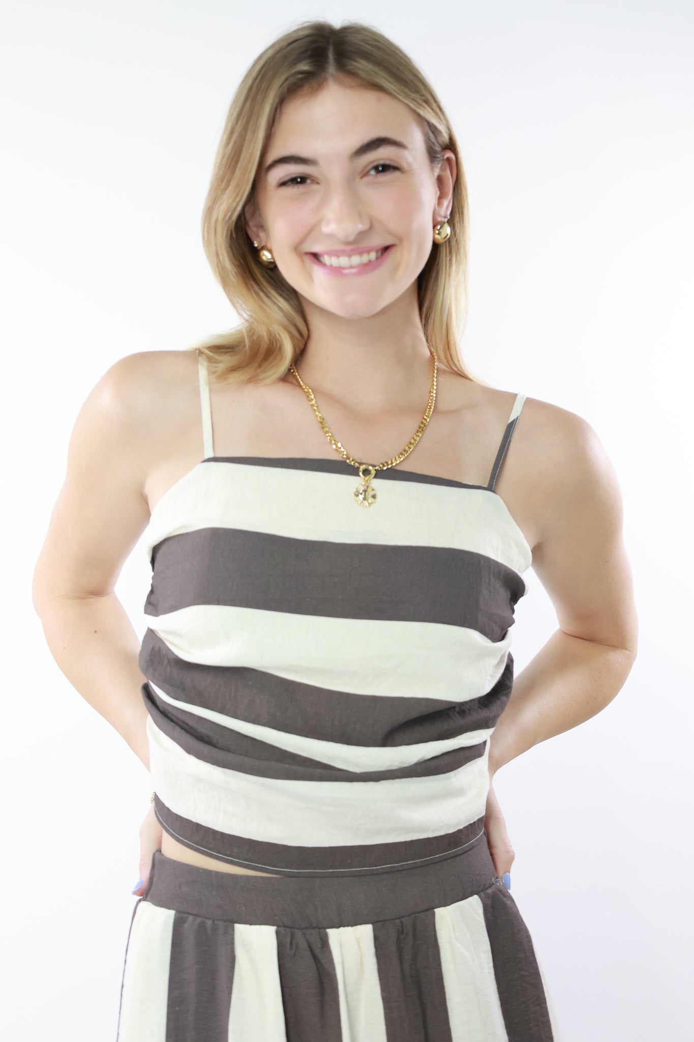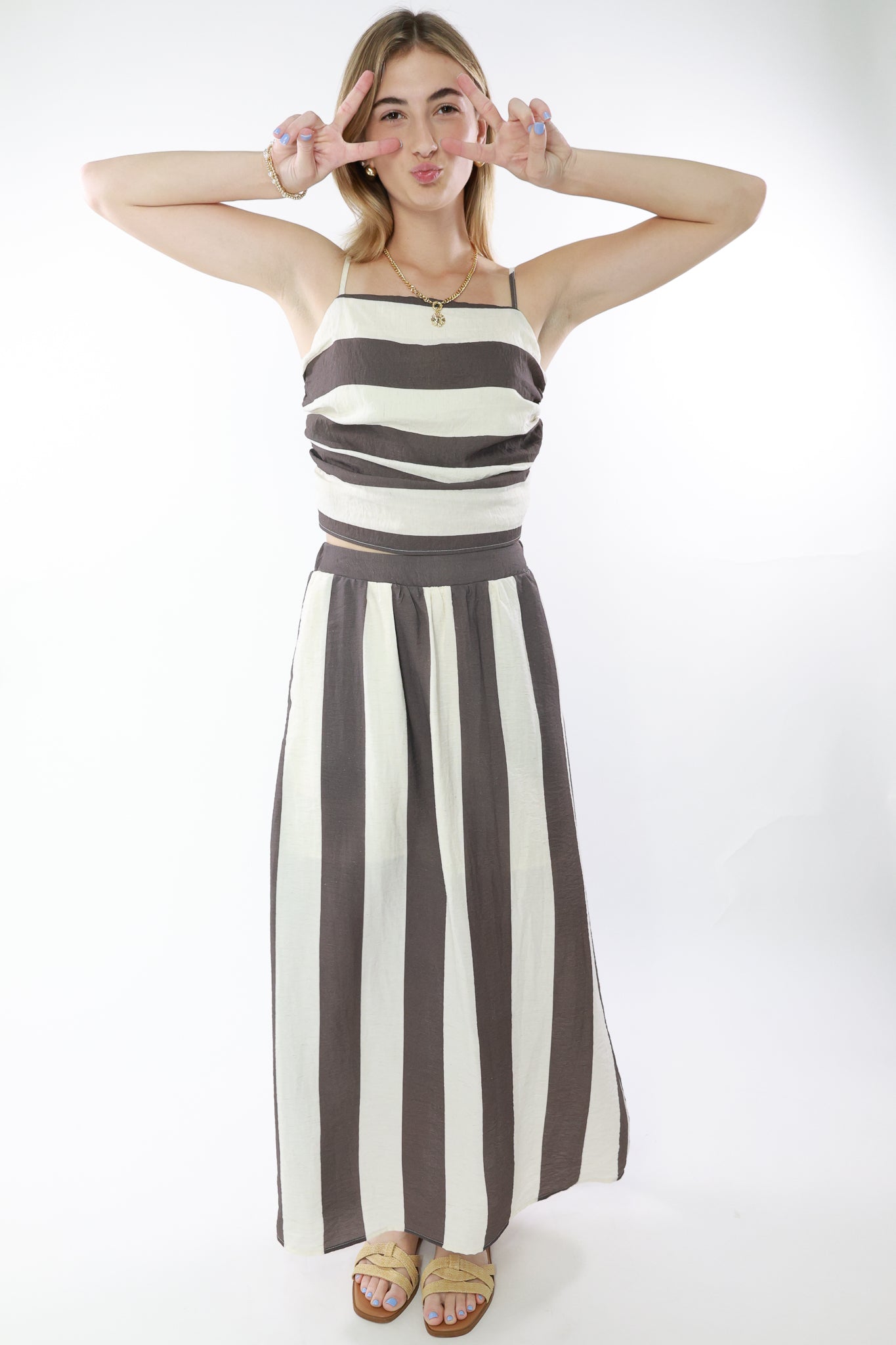 Update your summer wardrobe with the Maddie Stripe Set! This fun and quirky, linen blend set includes a side zipper midi skirt, featuring wide brown and cream stripes, and a back tie closure for a playful touch. Perfect for any occasion, this set is sure to make a statement. (Skirt and top included.)