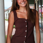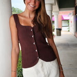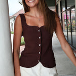 The Mallory Top is a sleeveless ribbed knit that’s both comfy and trendy. It features cool silver decorative buttons down the front, adding just the right amount of shine to your look. Great for layering or wearing on its own for a laid-back, stylish vibe.