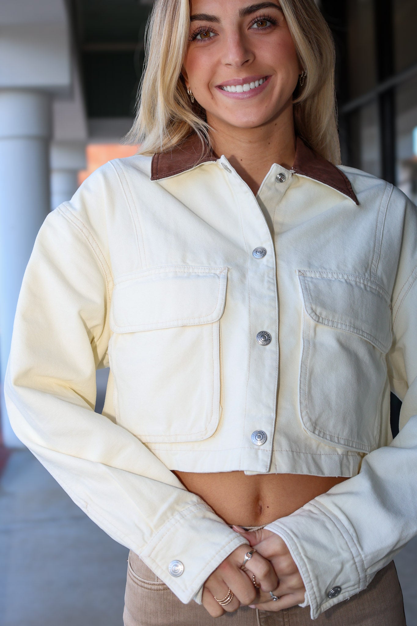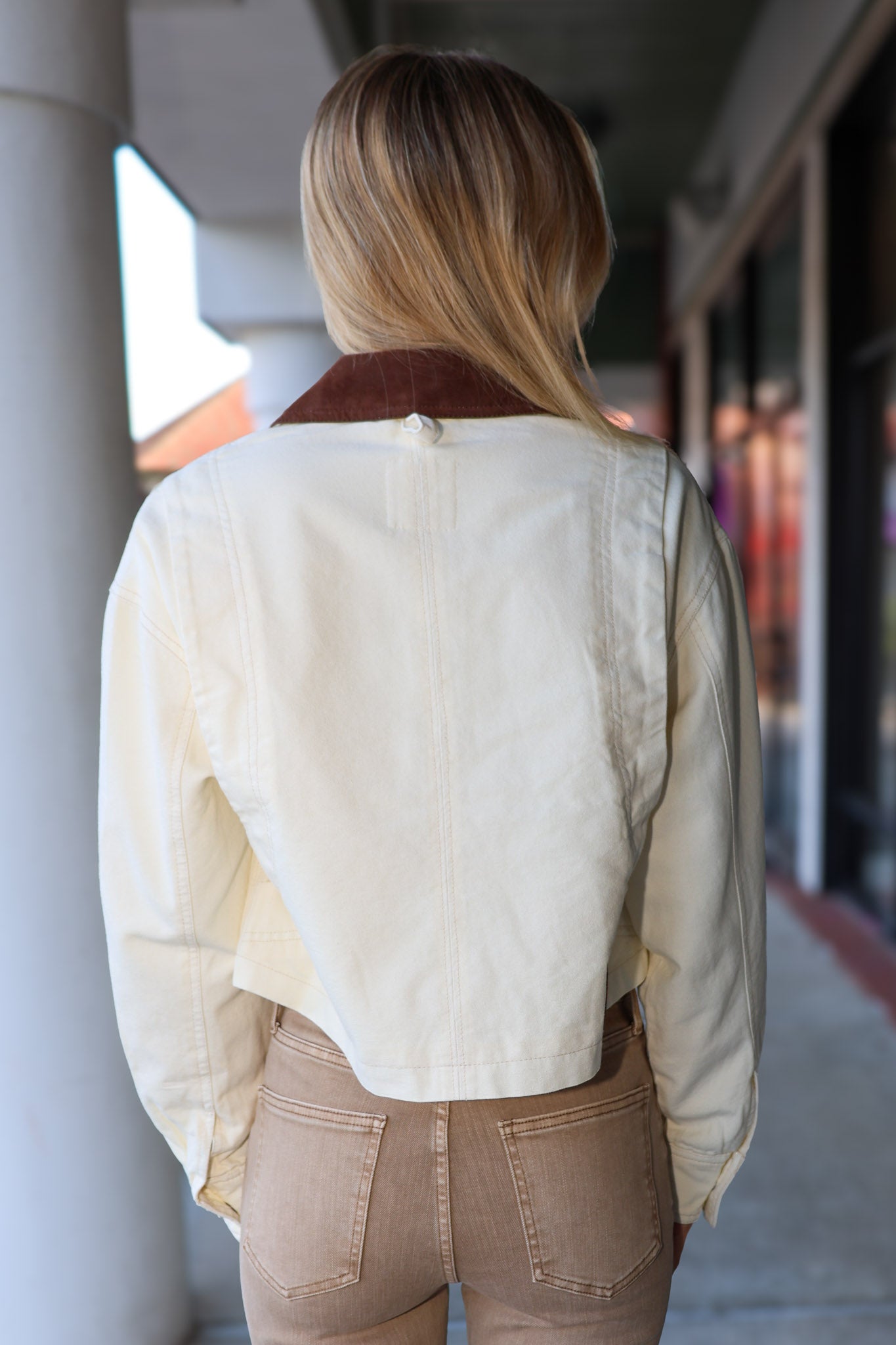 The Martha Workwear Jacket by Free People is a cropped, boxy take on classic utility style. Built from sturdy cotton twill with a timeless collar, button-front closure, and functional utility pockets, it's got that rugged edge. Drop-shoulder sleeves add an effortless vibe while the cropped length keeps things fresh and feminine. Work-inspired, but make it fashion.