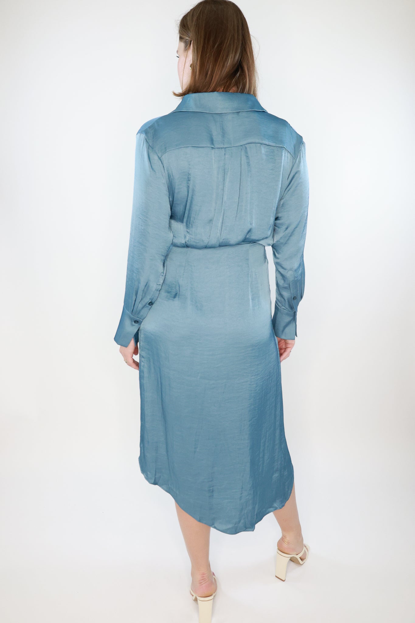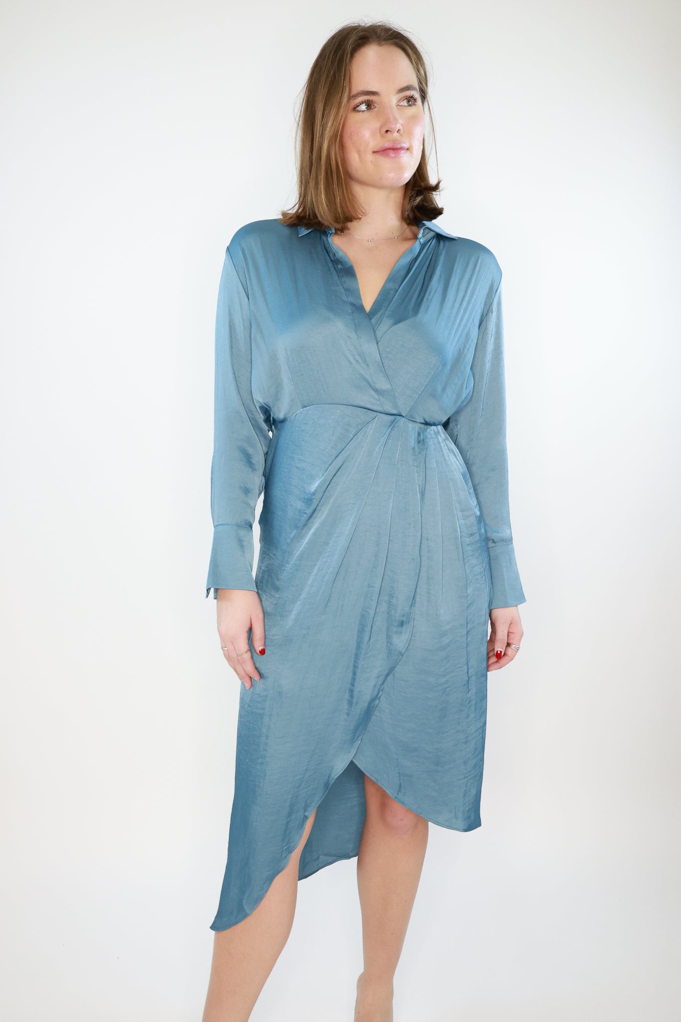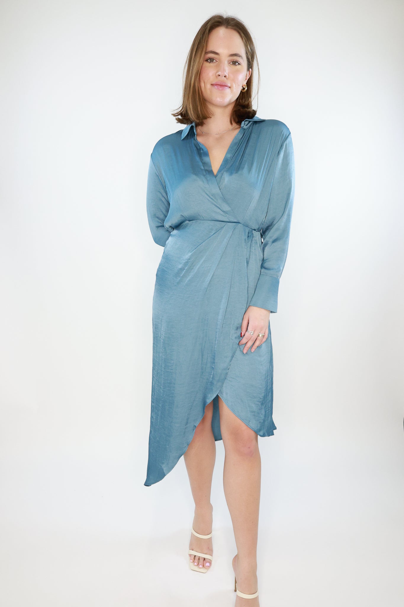 Expertly crafted with a satin fabric, the Martina Dress boasts a wrap design and long sleeves, making it a timeless and versatile addition to your wardrobe. Elevate any occasion with its elegant midi length.