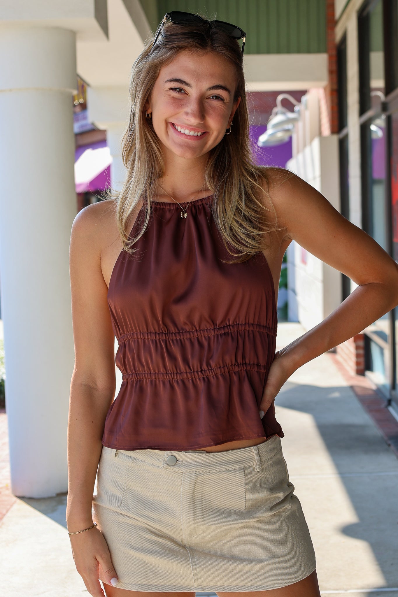 The Michelle Mini Skort in ecru denim is the perfect mix of cute and casual. It’s great for hanging out or running errands, giving you a cool, laid-back vibe with a fresh, light color that goes with everything.