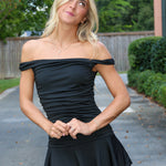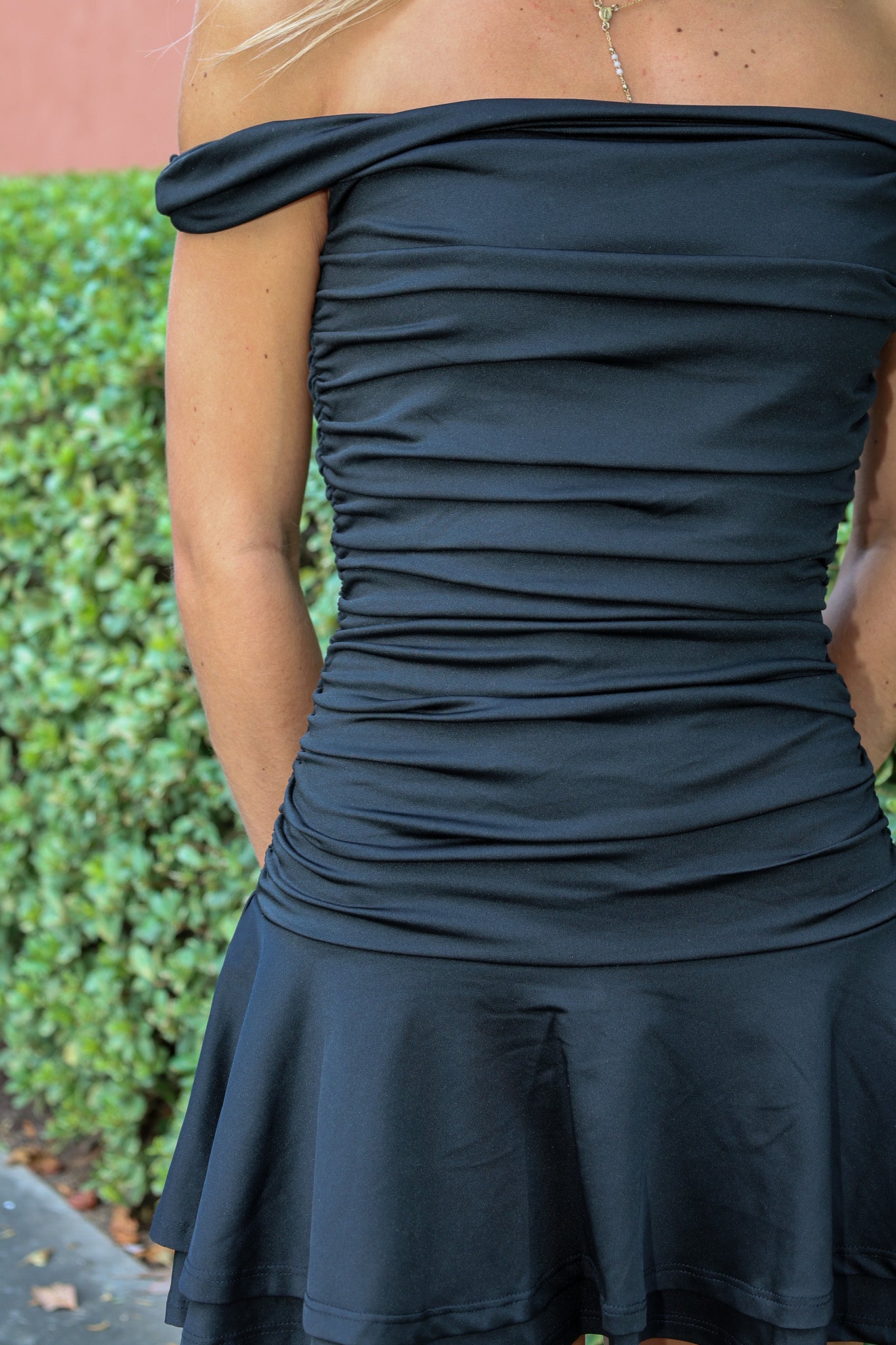 This black mini skirt features ruched sides that add a trendy, textured look, while the ruffle layers give it a fun and flirty vibe perfect for any casual hangout or party. Its playful design makes it easy to pair with crop tops or graphic tees for a stylish, youthful outfit.