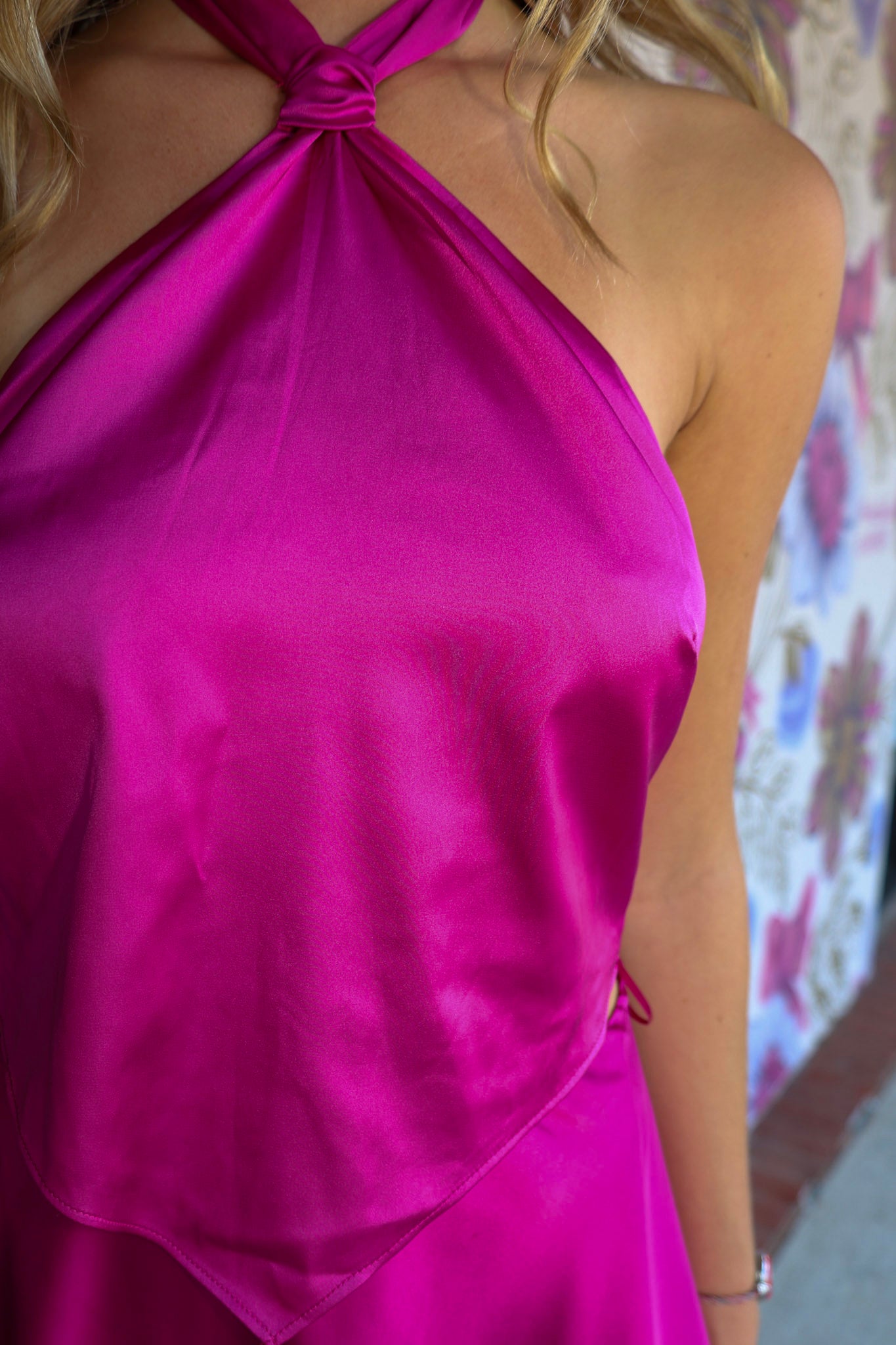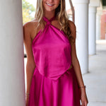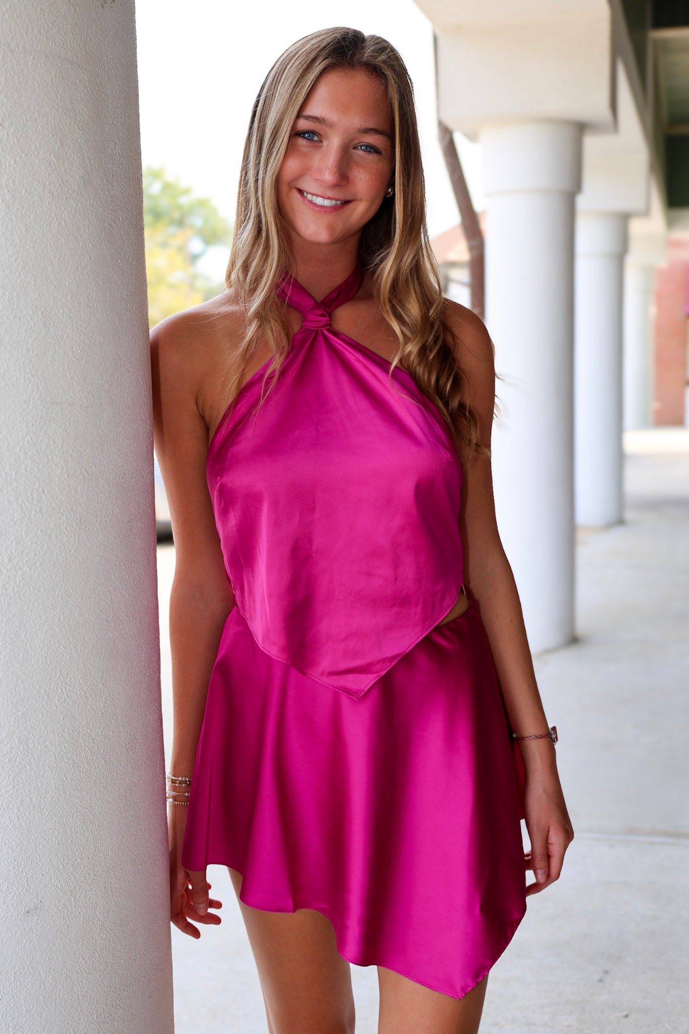 The Marilyn Skirt Set is a fun and flirty outfit featuring a halter top with a cool tie-back and neck detail. Both the top and skirt have an asymmetrical hem that adds a trendy, edgy vibe. Perfect for making a statement at any party or casual hangout!