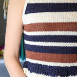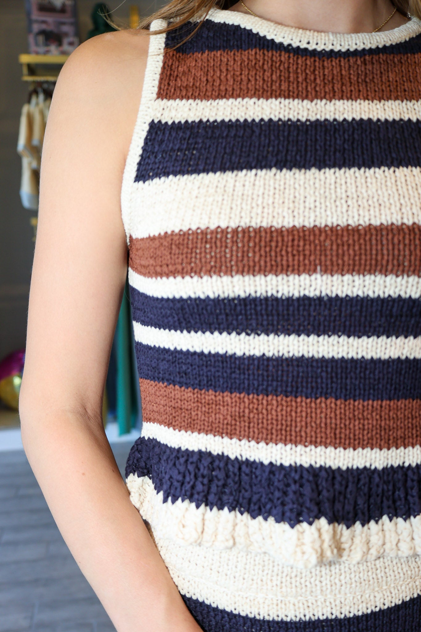 Effortless elegance meets timeless style with the Nancy Set. This coordinated knit duo features a sleeveless striped top paired with a midi skirt, both crafted in soft, breathable fabric. The rich brown, navy, and ivory stripes create a classic look. The peplum hem adds a flattering silhouette and subtle movement. Perfect for those who love put-together pieces that require minimal styling effort.
