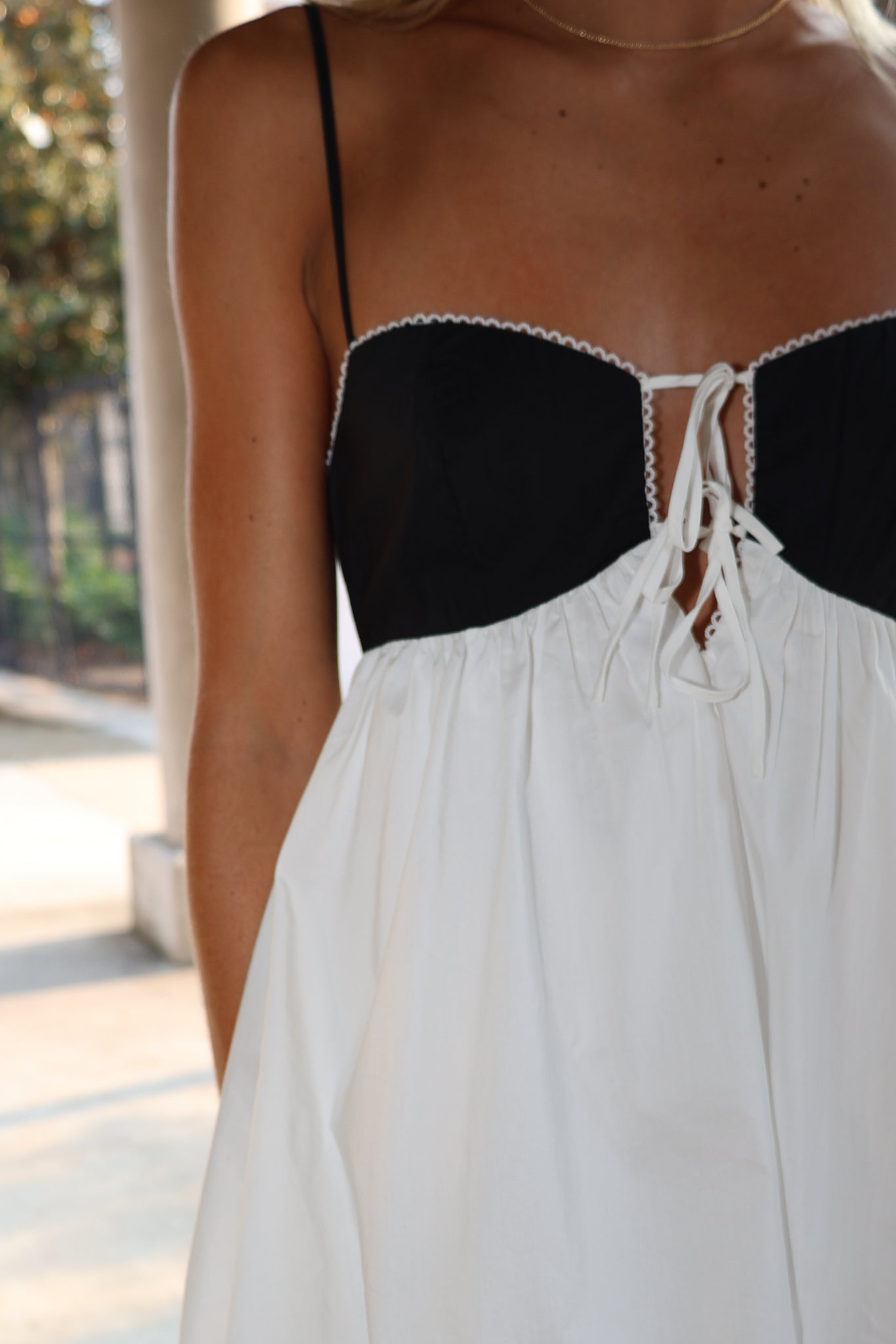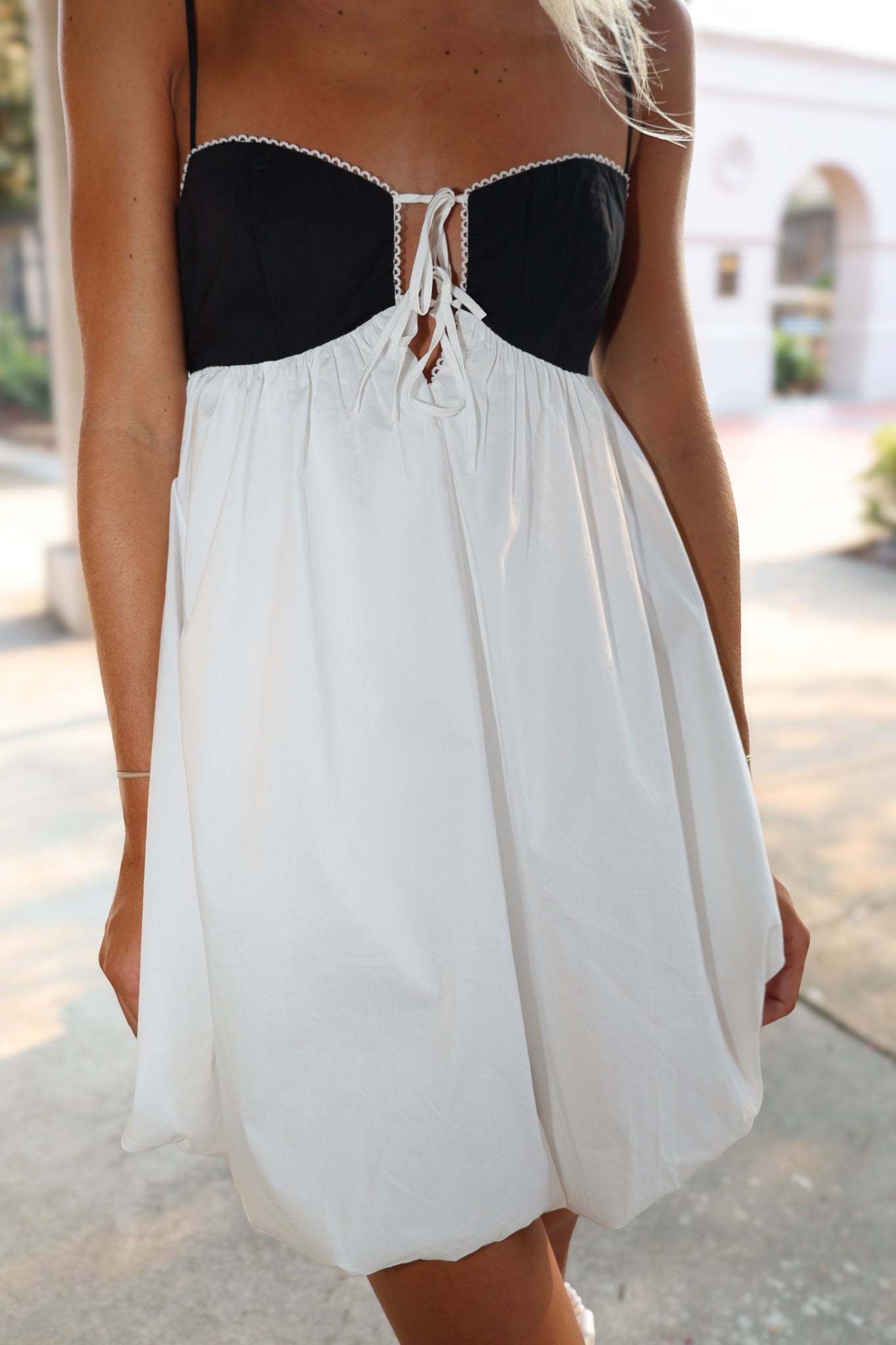 The Nicolette Dress is a fun mini bubble skirt with a cool two-toned look. It’s sleeveless and features delicate lace trim for a cute touch. The front tie closure adds a playful vibe, making it perfect for hanging out or going to parties. Easy to wear and super stylish!