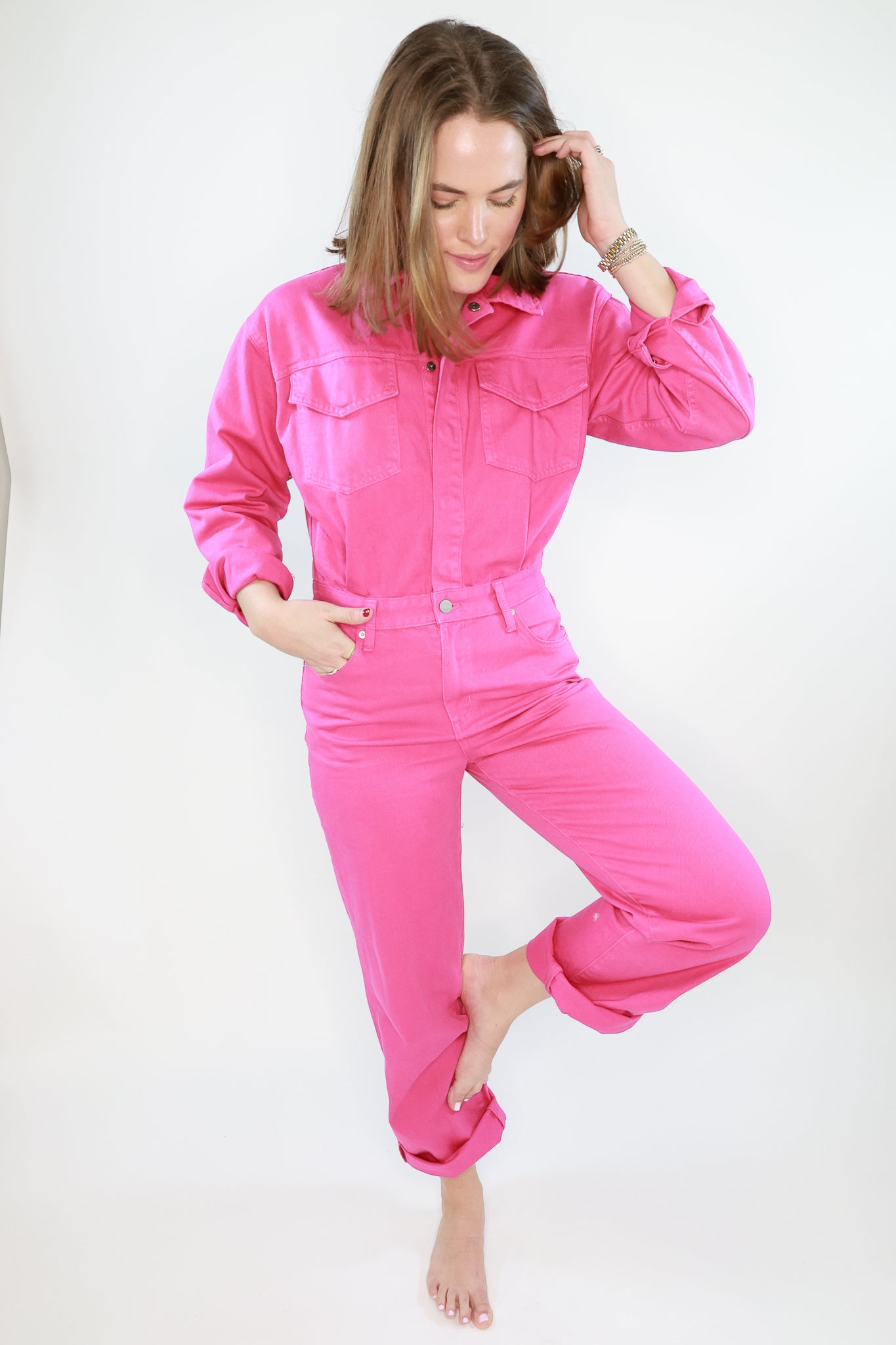 Introducing the Nikkie Jumpsuit by Pistola. This hot pink long sleeve jumpsuit features a snap front closure for added convenience. Made with high-quality materials and a trendy design, this jumpsuit is perfect for any fashion-forward individual looking to make a statement. Stay stylish and comfortable in the Nikkie Jumpsuit.