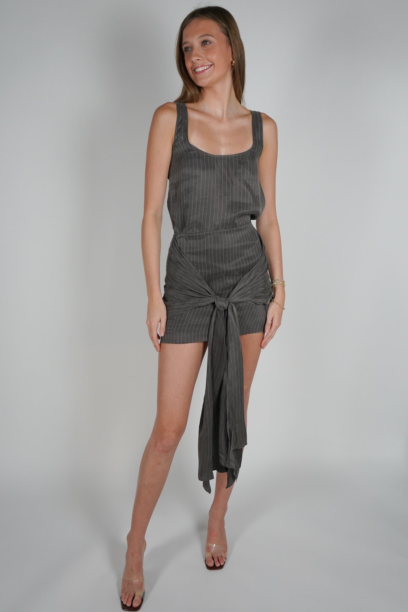 Elevate your wardrobe with the Nova Top! This sleeveless satin shirt features a subtle gray and white pin stripe design, adding a touch of sophistication to any outfit. Feel confident and chic in this must-have piece. Pair with The Lily Skirt to complete the look.