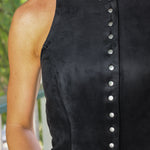 The Oliviera Dress is giving main character energy. This fitted mini hugs you in all the right places with a sleek high neckline and edgy silver studs running down the front and neckline for that extra glam factor. Perfect for turning heads at parties, nights out, or whenever you want to feel absolutely fierce.