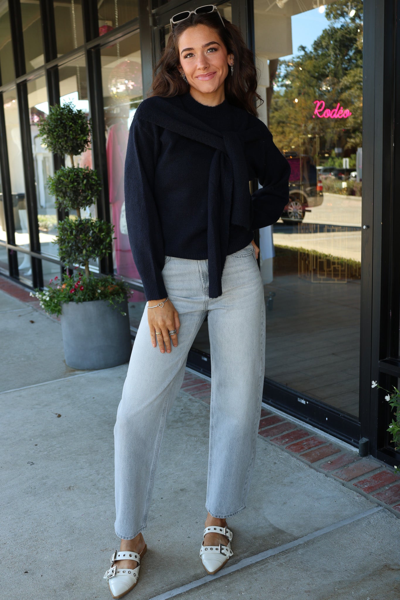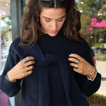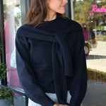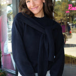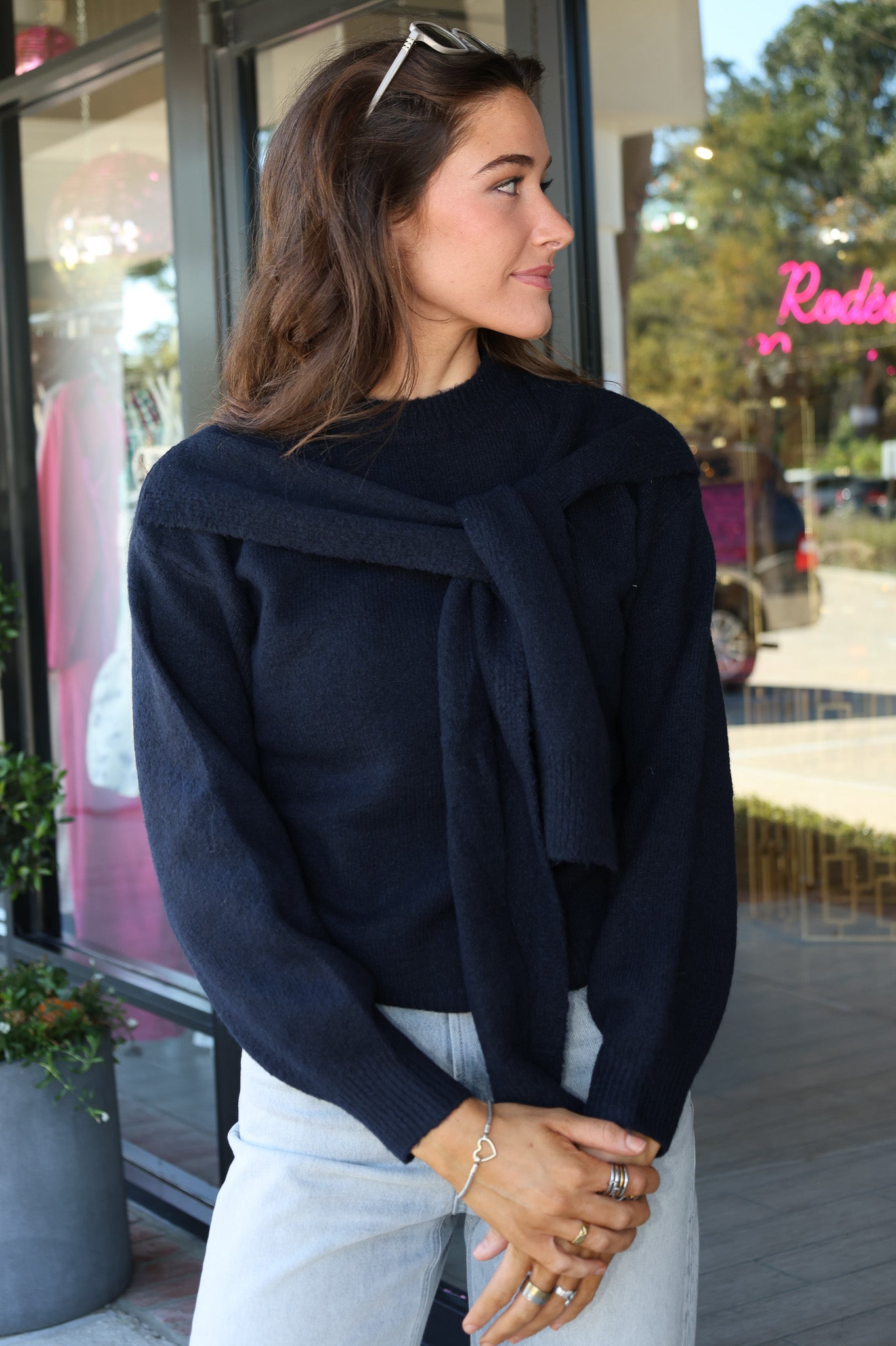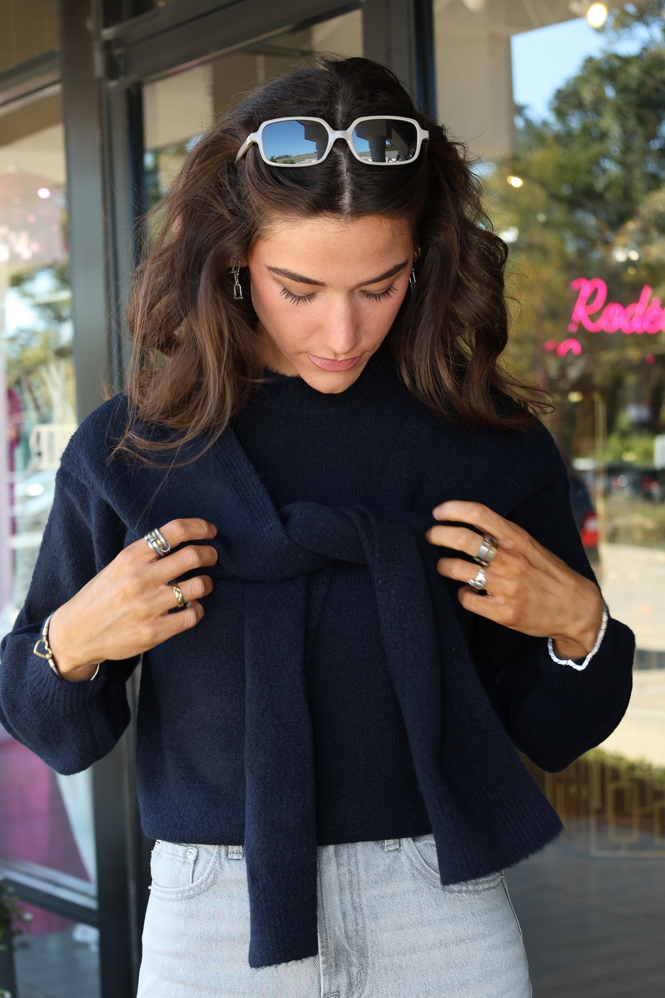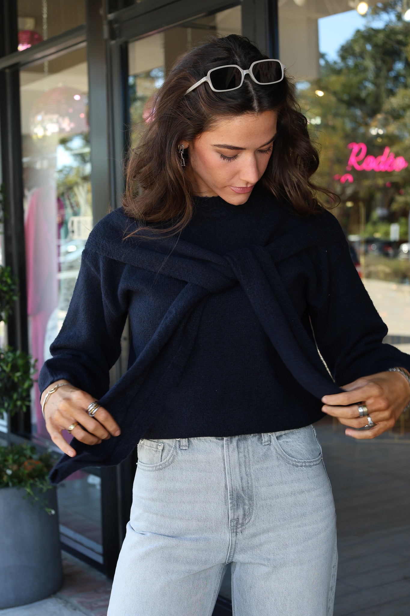 The Oscar Sweater is giving major preppy vibes with its classic navy knit and that adorable front tie scarf detail. Perfect for layering over your favorite tee or dressing up for a more polished look. Whether you're heading to class or hanging with friends, this sweater keeps you looking effortlessly put-together. The tie scarf adds just the right amount of personality to make it totally yours.