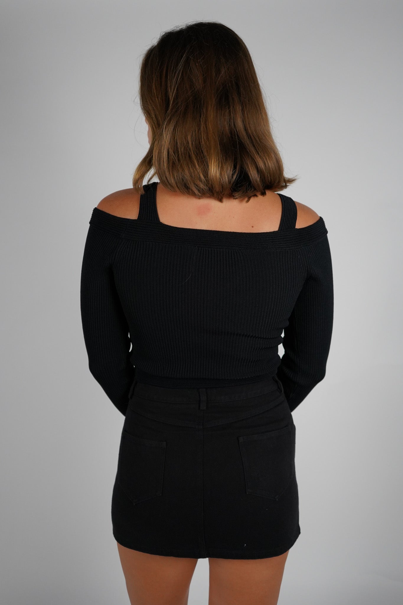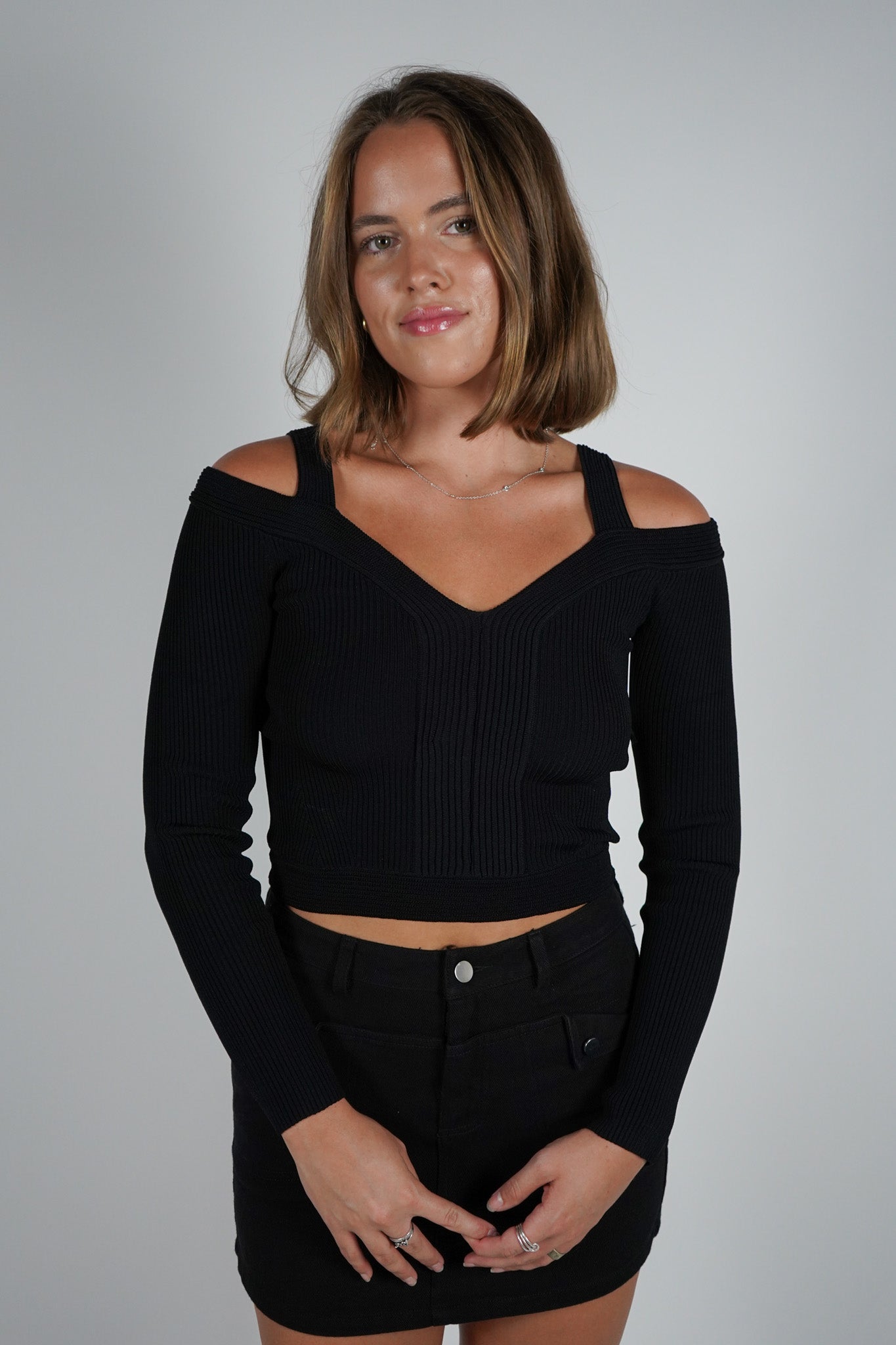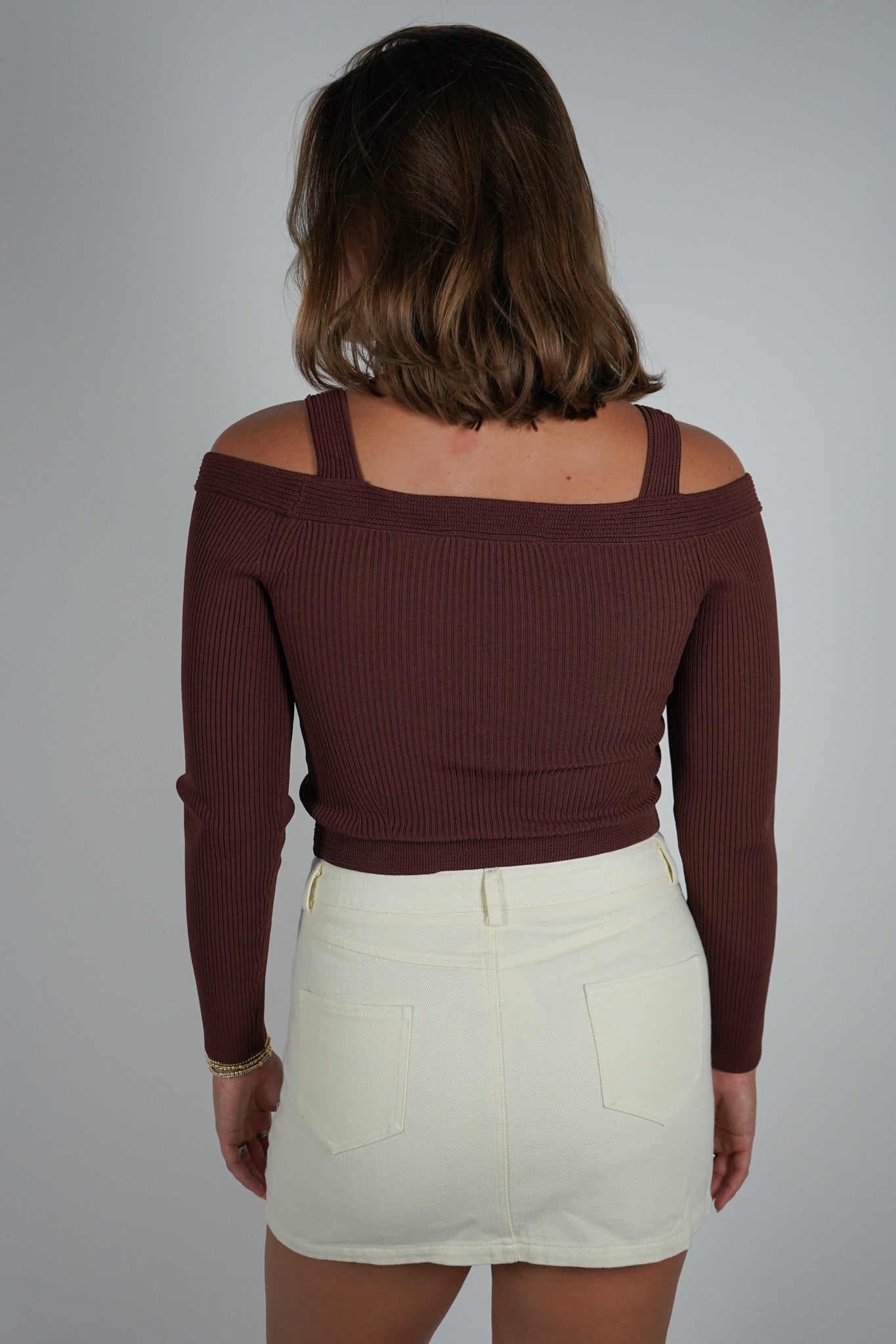 Introducing the Pacey Sweater, the versatile and stylish ribbed off-the-shoulder top. Made with long sleeves and available in two classic colors - brown and black - this sweater is perfect for any occasion. Elevate your wardrobe with this must-have piece that offers both comfort and style.