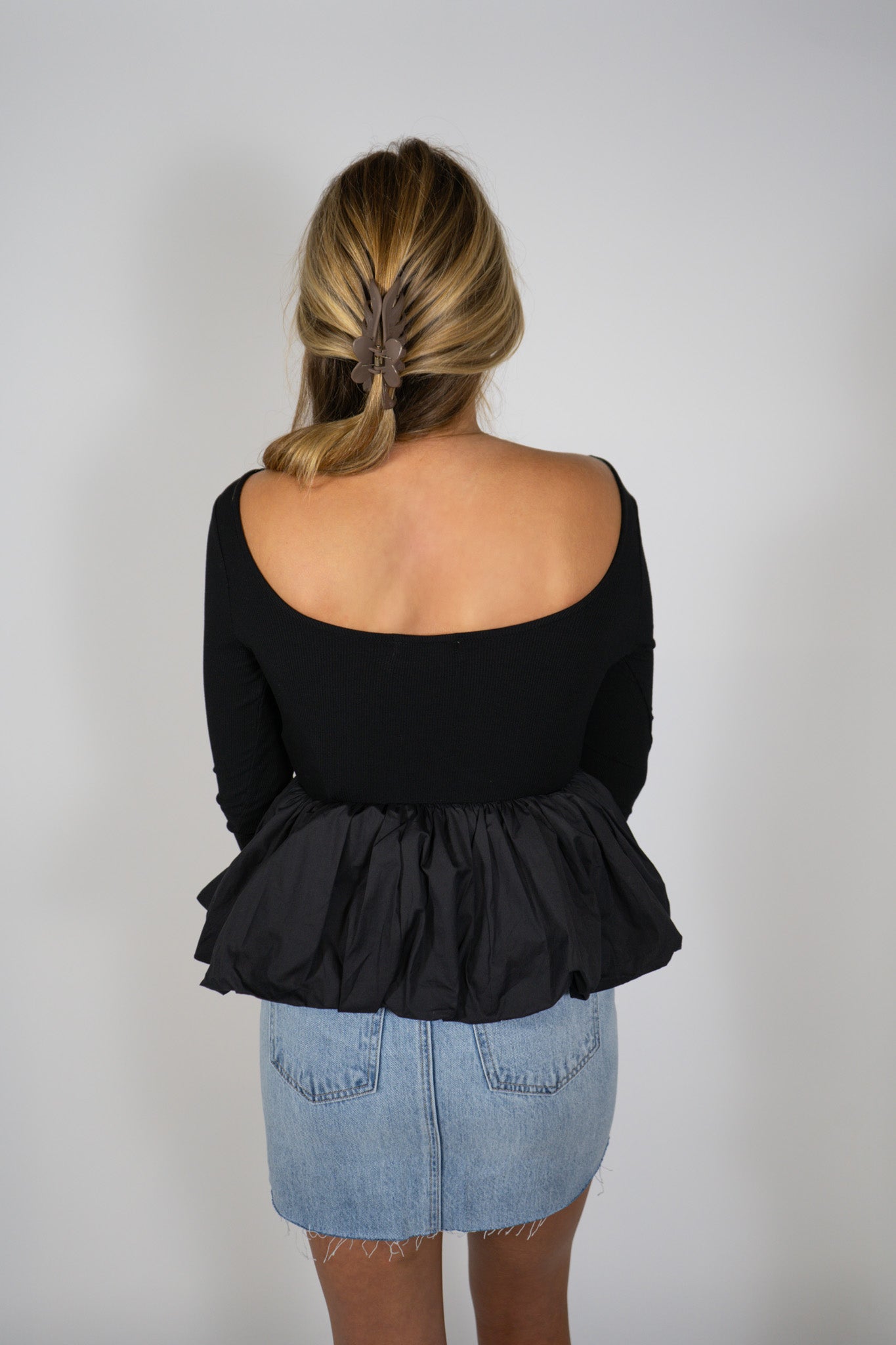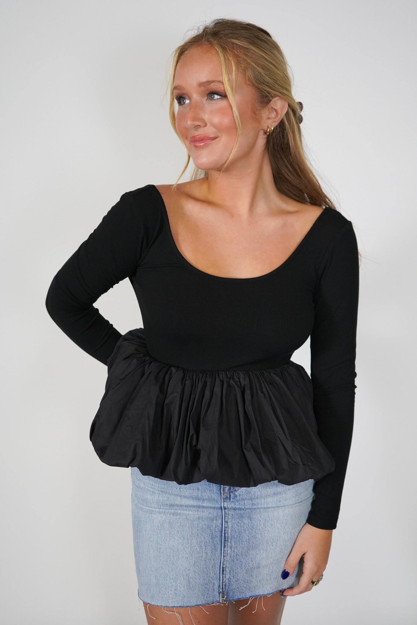 Get ready to add some fun to your wardrobe with the Paige Ribbed Top! This long sleeve top features a ribbed texture and a playful bubble bottom. Perfect for any occasion, it's a must-have for effortless style. (No more boring tops for you!)