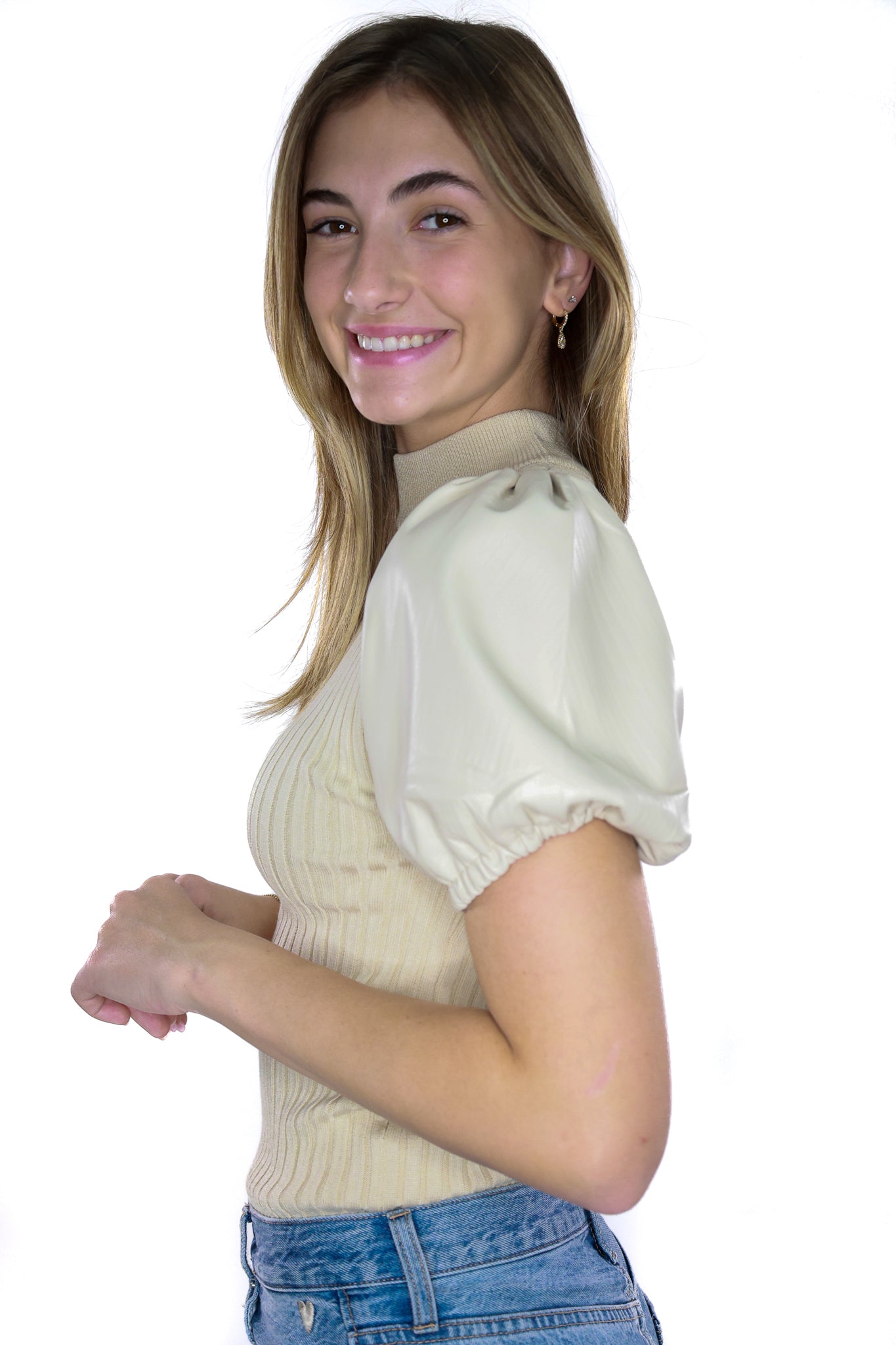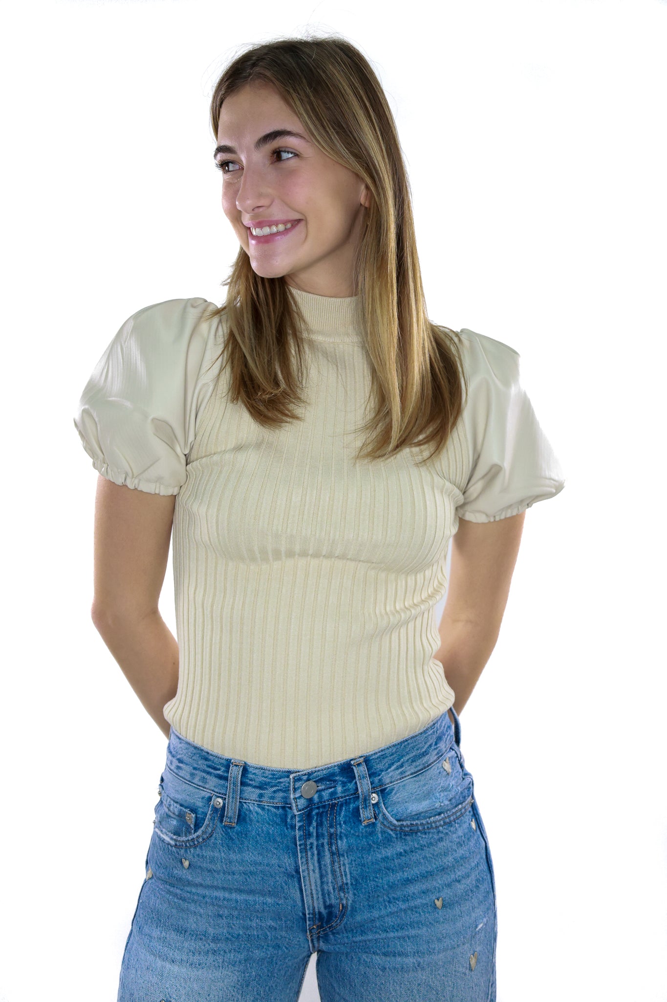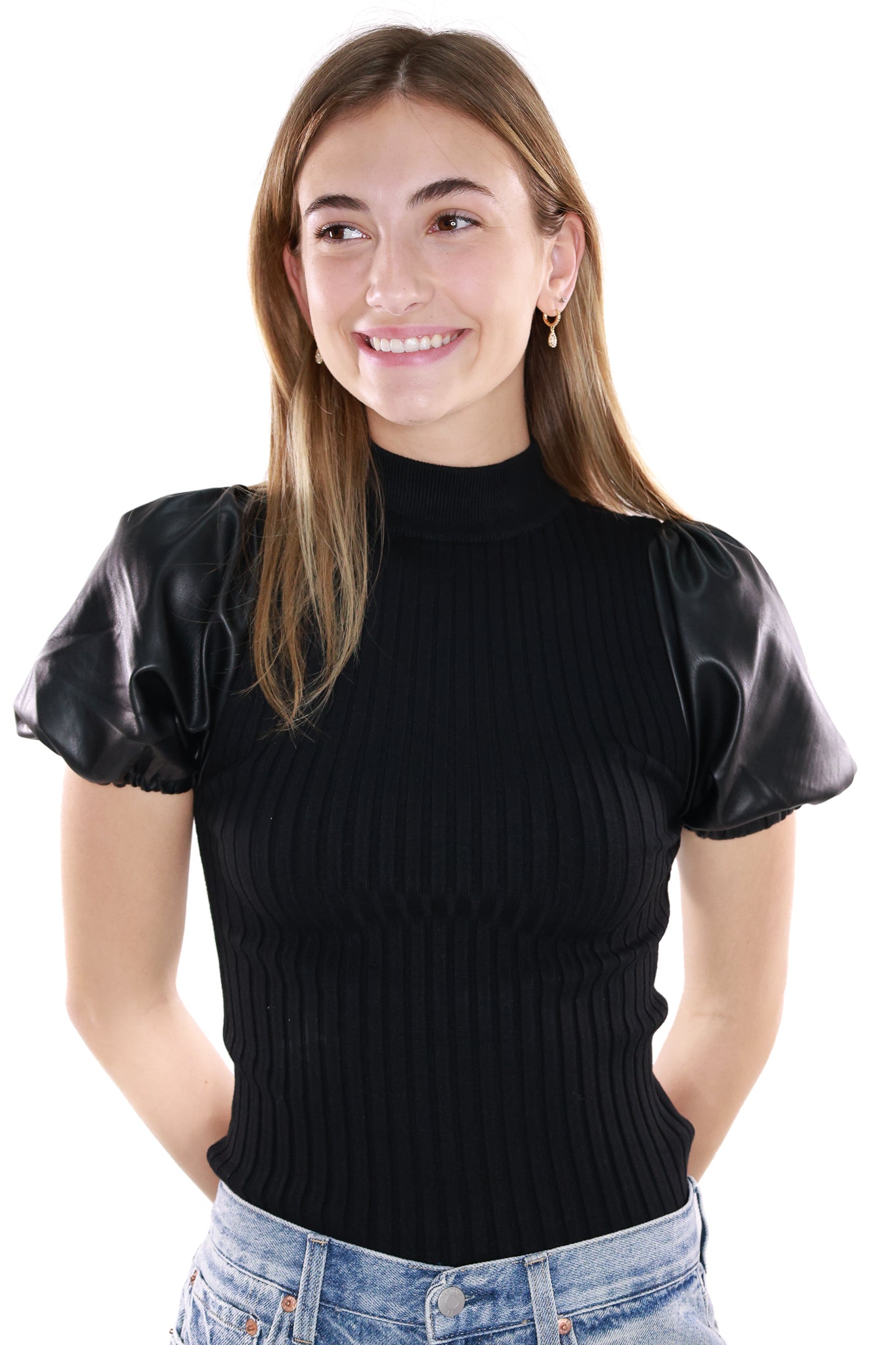 The Peggy Sweater offers a unique blend of textures with its mixed media ribbed body and faux leather puff short sleeves. This versatile garment is perfect for adding a touch of edginess to any outfit, while still providing all-day comfort. Embrace the fashion-forward vibe of this statement piece. Available in 2 colors: Bone and Black