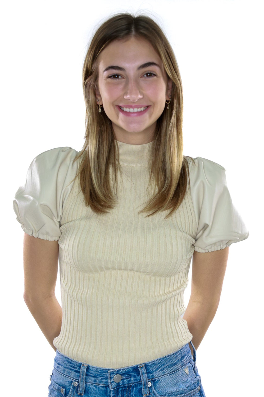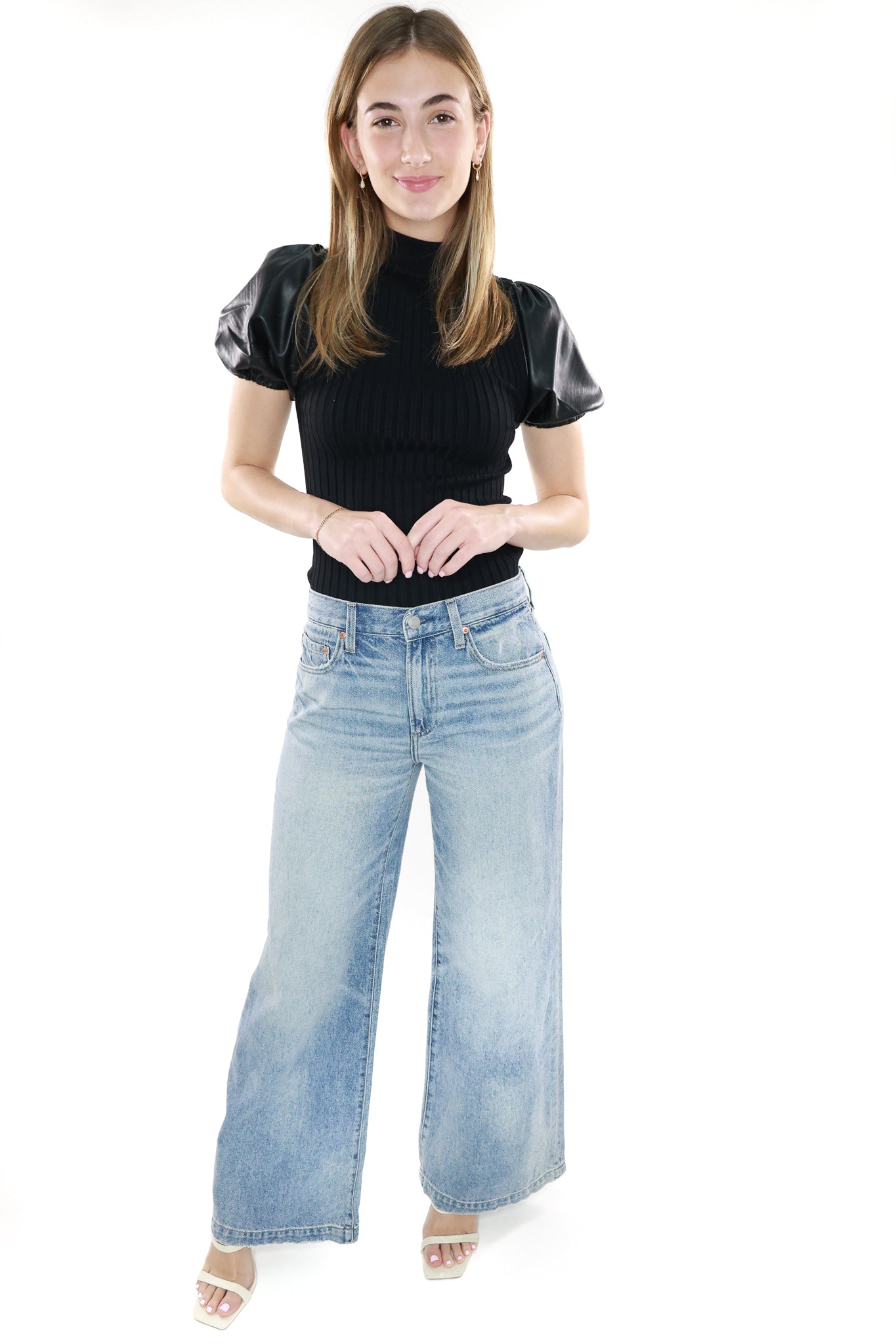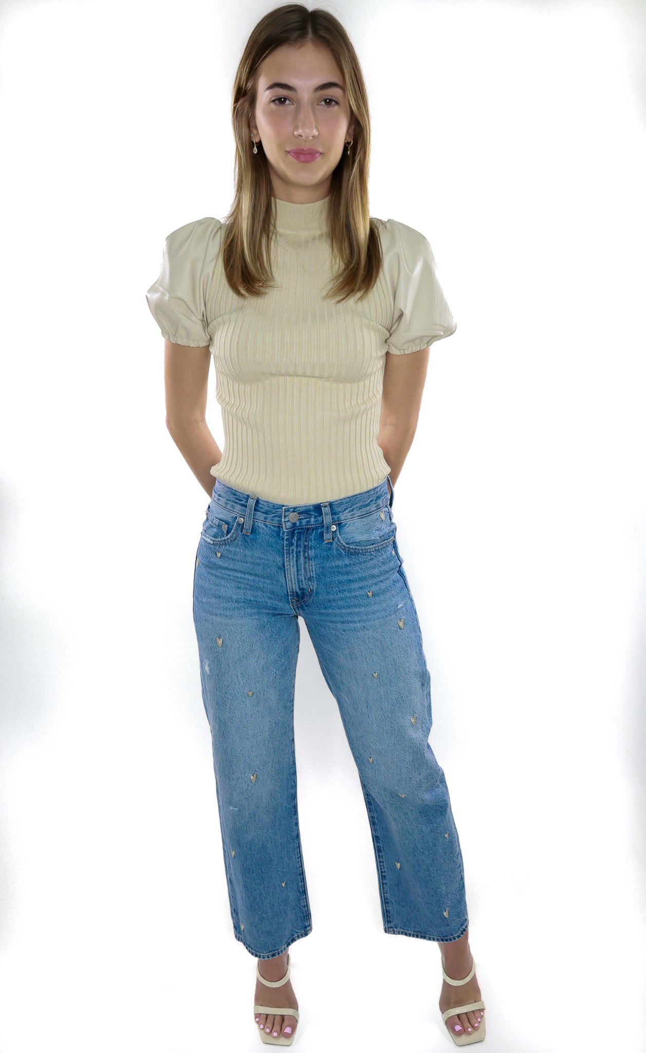 The Peggy Sweater offers a unique blend of textures with its mixed media ribbed body and faux leather puff short sleeves. This versatile garment is perfect for adding a touch of edginess to any outfit, while still providing all-day comfort. Embrace the fashion-forward vibe of this statement piece. Available in 2 colors: Bone and Black