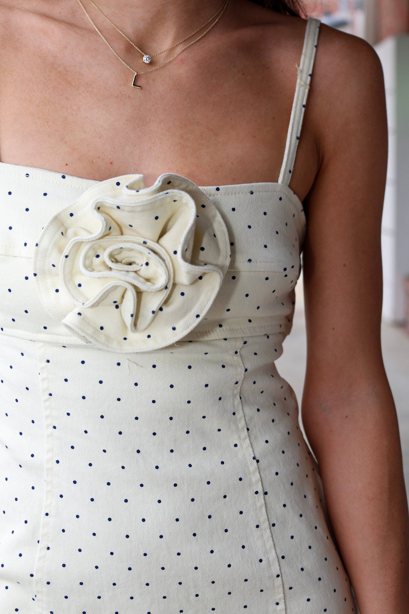 Cute ivory mini dress with delicate black polka dots and a charming rosette accent, featuring a practical side zipper for easy wear. The denim details add an unexpected edge to this sweet, versatile piece.