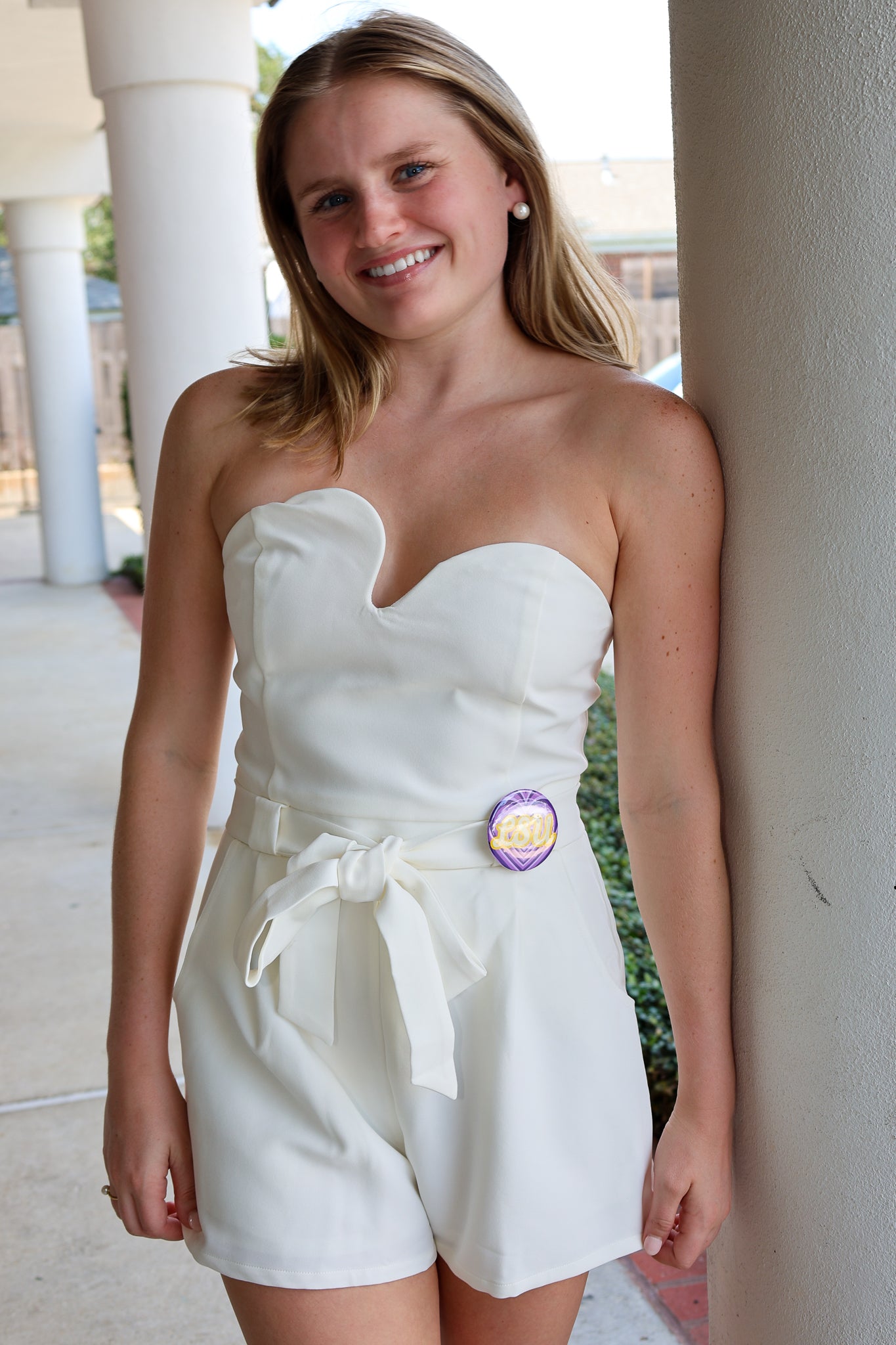 This Polly Pocket Romper is the ultimate summer vibe—strapless and lined for comfort, it fits like a dream. The puzzle top adds a fun twist, while the matching tie belt defines your waist perfectly. Zip it up in the back and you’re ready to shine!
