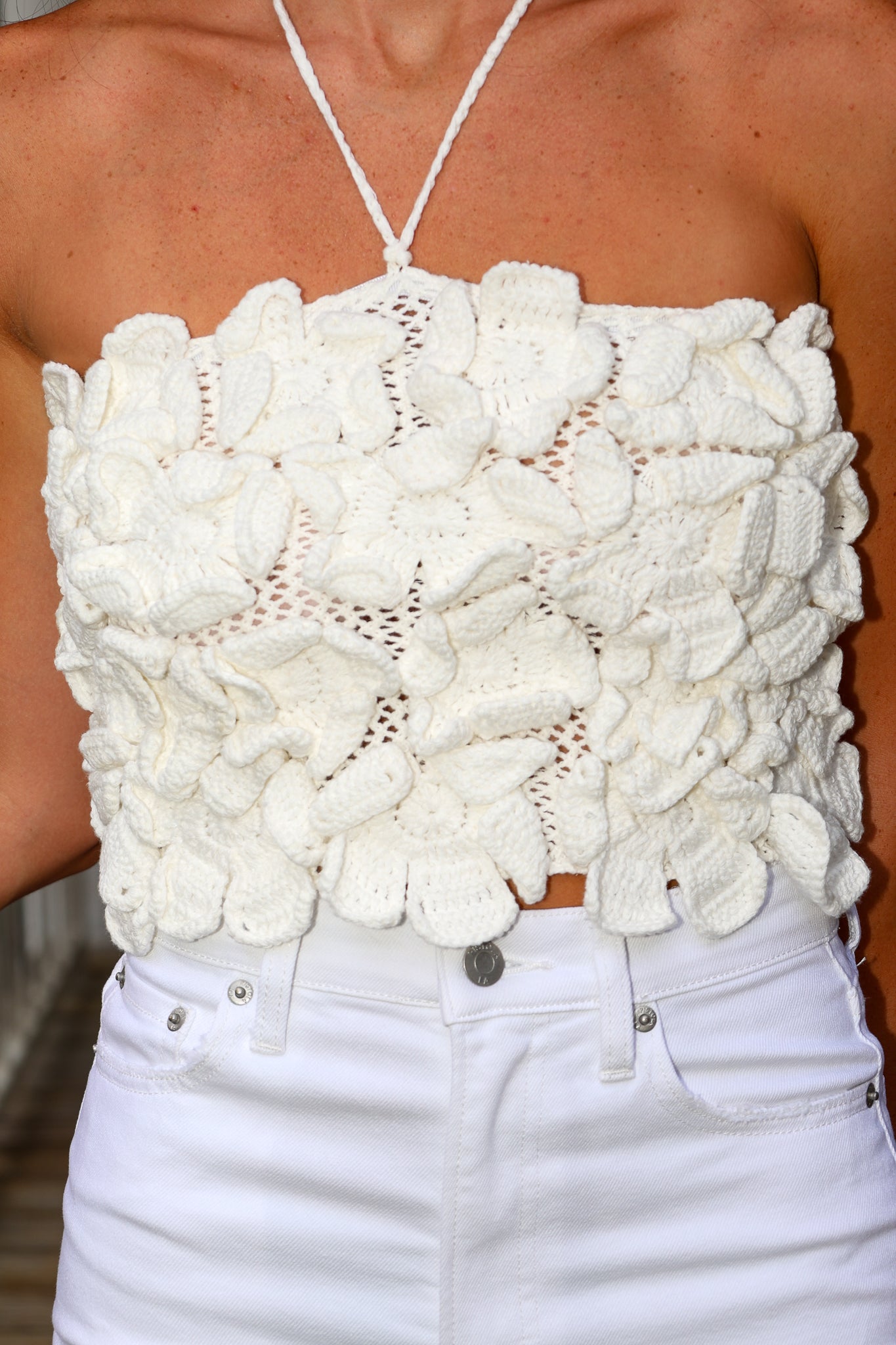 The Primula Top is a trendy 3D crochet tube top that’s all about summer vibes. It laces up and ties in the back for a perfect, adjustable fit. Lightweight and stylish, it’s great for hanging out or adding a cool touch to any outfit.