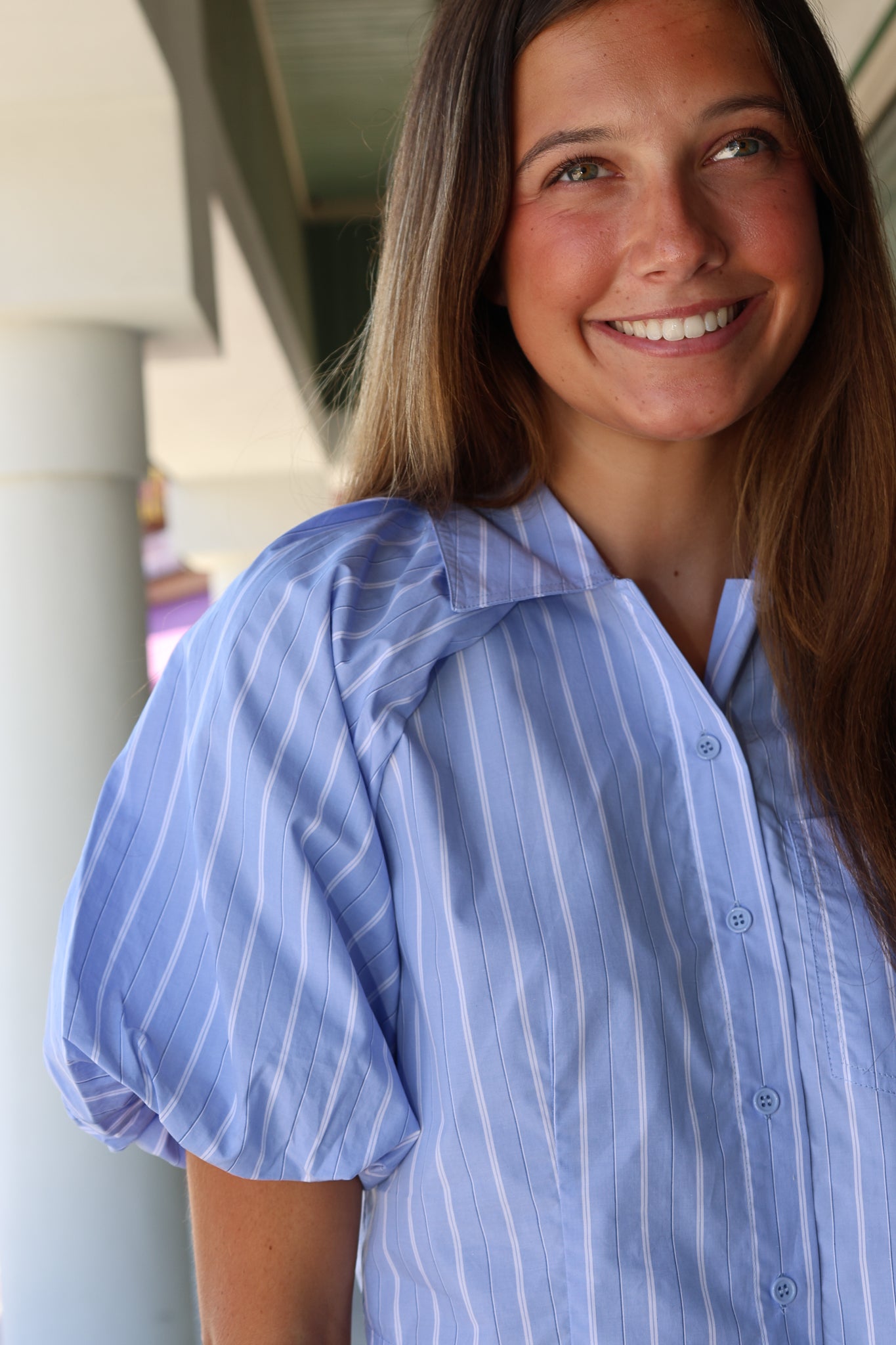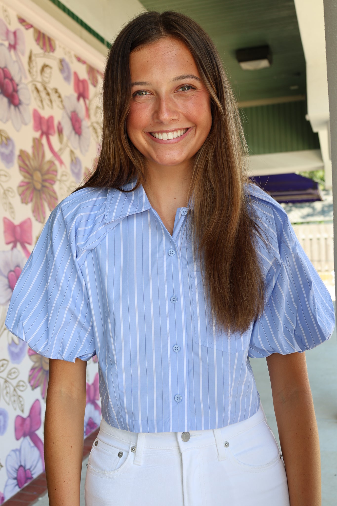 The Reece Top is a cute puff short sleeve button-down with blue stripes that gives off major fun and fresh vibes. Its lightweight fabric keeps you comfy all day, while the playful sleeves add a trendy touch to any outfit. Perfect for hanging out or casual days, this top is easy to dress up or down.