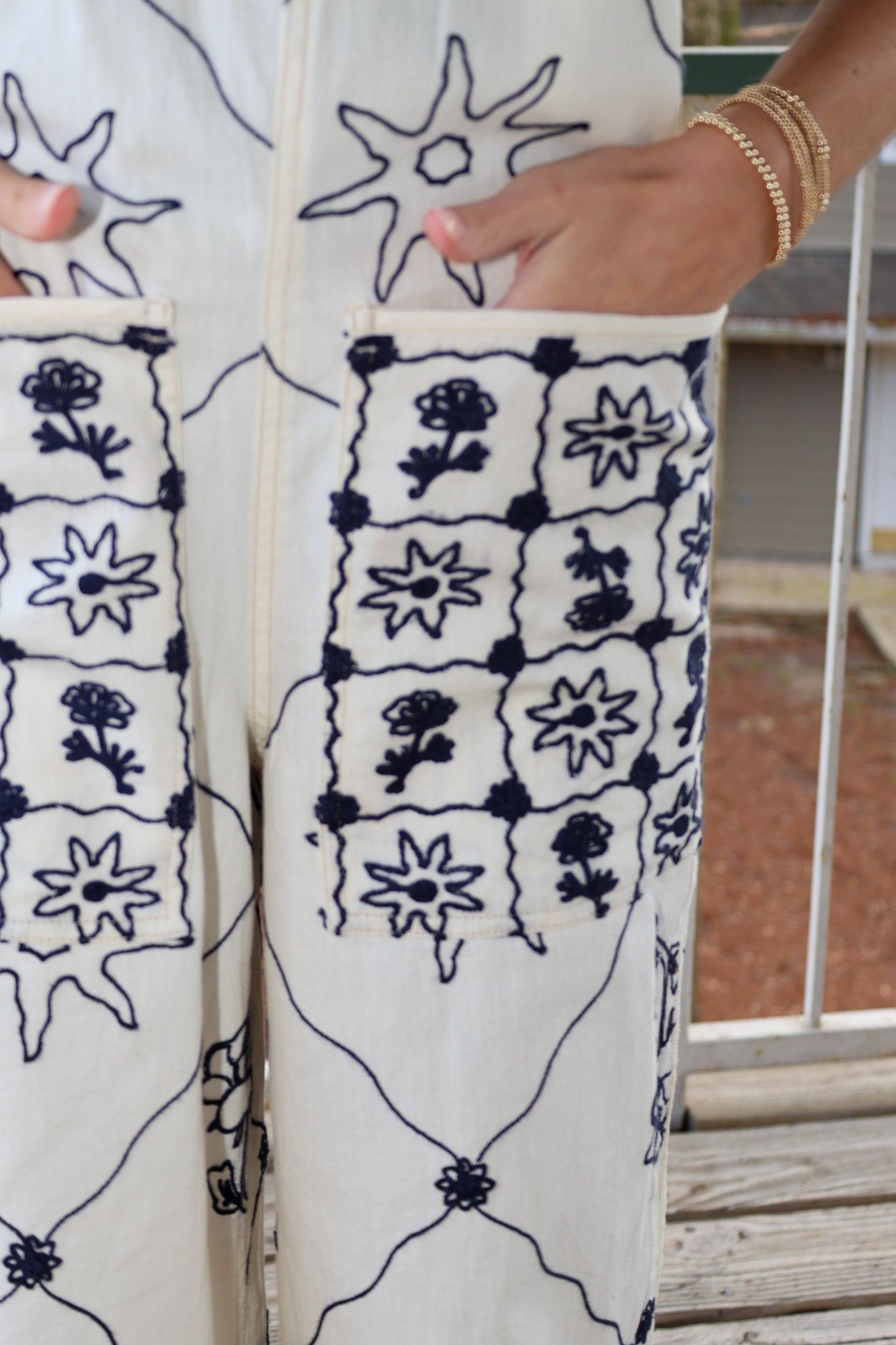 Relaxed, classic overalls are anything but basic. Adjustable brace straps, whimsical embroidery details add personality throughout. Classic pouch pockets keep it functional. Pair with court sneakers for laid-back energy or ballet flats for a sleeker take—this overall is endlessly versatile.