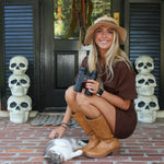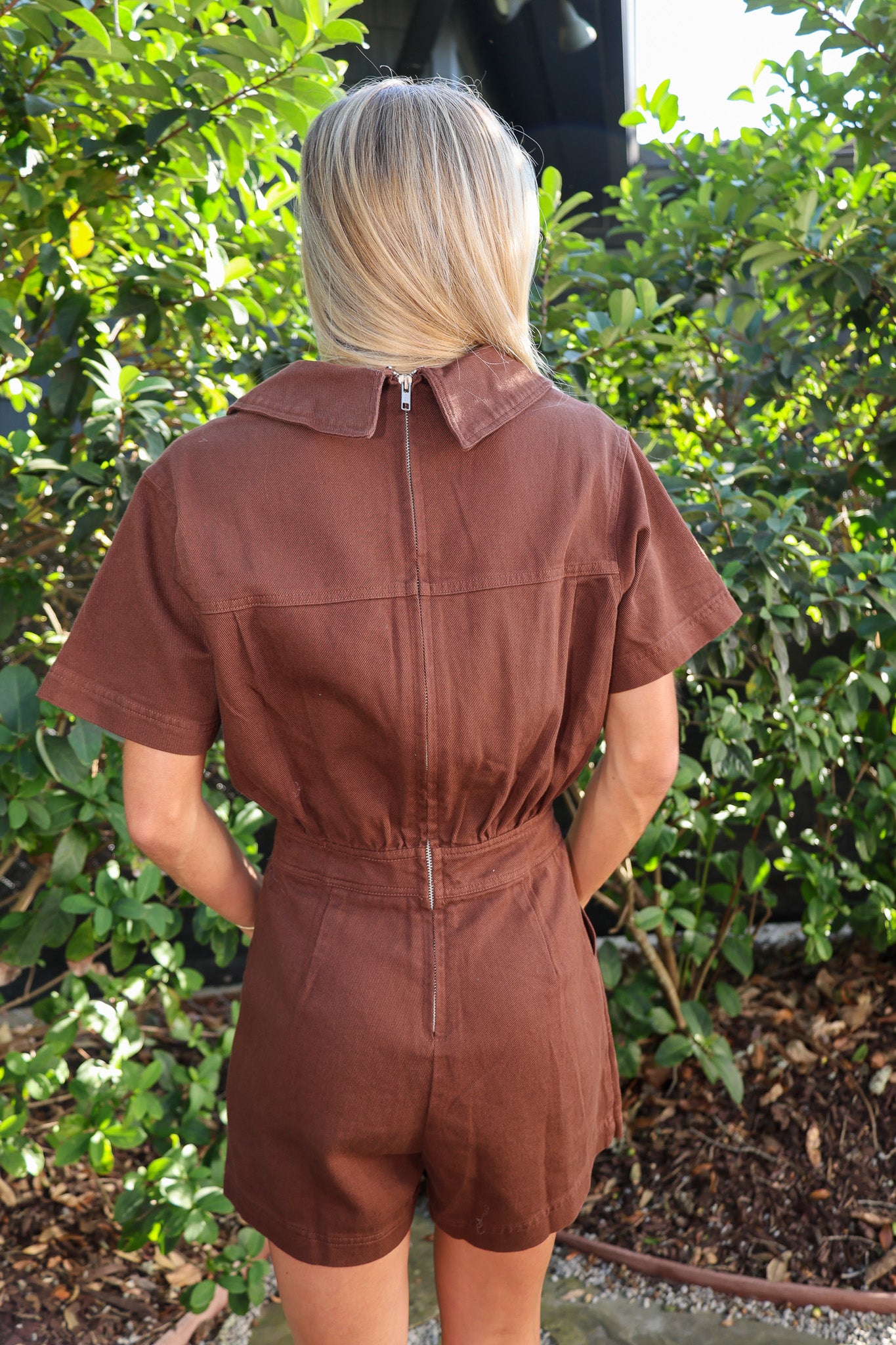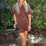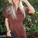 The Sabrina Romper is your go-to for a cool, casual vibe. Made from brown denim, it features a trendy v-neck collar and short sleeves that keep things chill. The back zipper adds an edgy touch and makes it super easy to slip on. Perfect for hanging out with friends or hitting up the weekend, this romper combines comfort and style effortlessly.