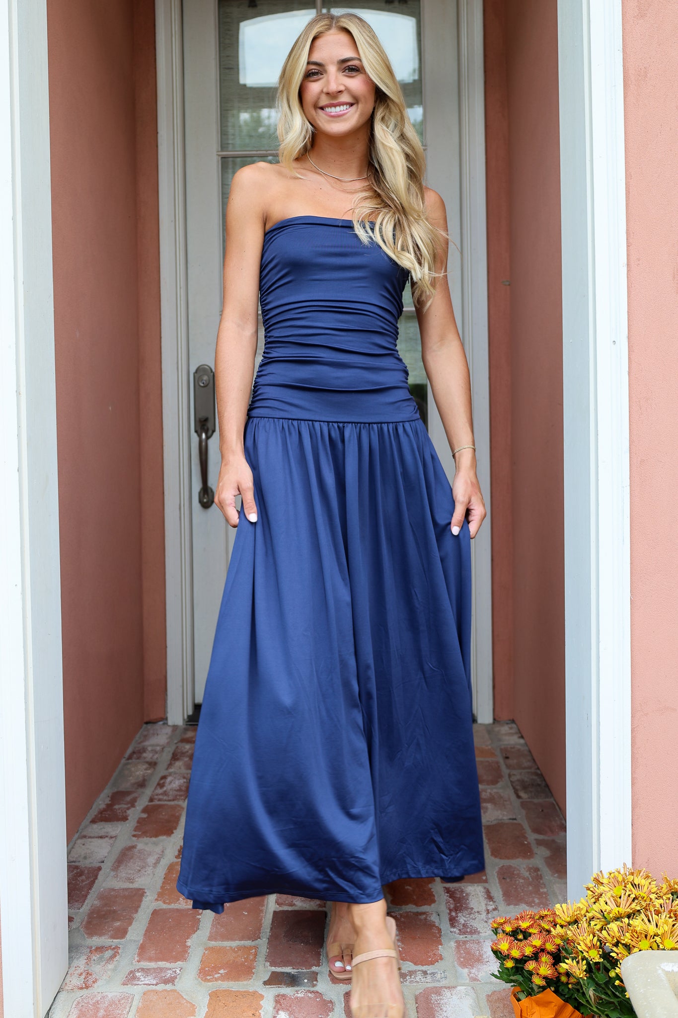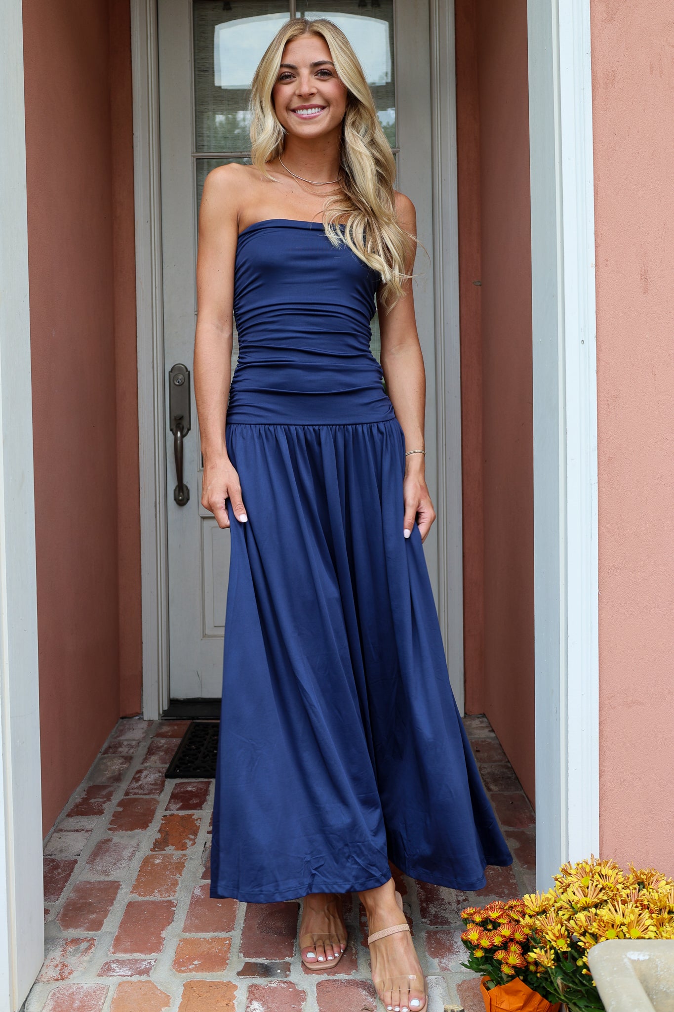 The Santal Dress is a strapless fit-and-flare style with ruched sides at the top for a flattering look. Its midi length makes it perfect for hanging out or dressing up while keeping things comfy and cute. Has pockets.