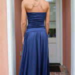 The Santal Dress is a strapless fit-and-flare style with ruched sides at the top for a flattering look. Its midi length makes it perfect for hanging out or dressing up while keeping things comfy and cute. Has pockets.