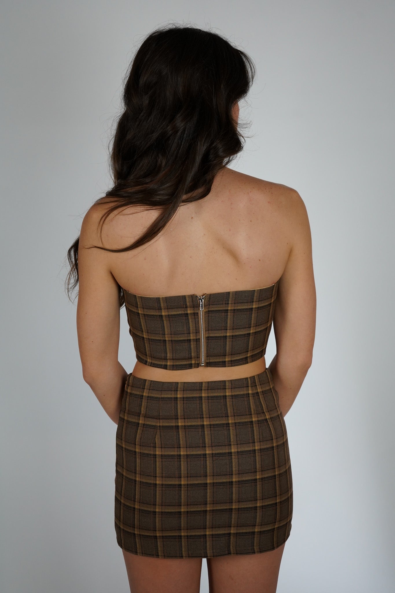 Introducing the Serena Mini Skirt, a chic addition to your wardrobe. With its brown plaid design, this mini skirt pairs perfectly with the Serena Top for a complete and polished look. Elevate your style with this versatile piece.